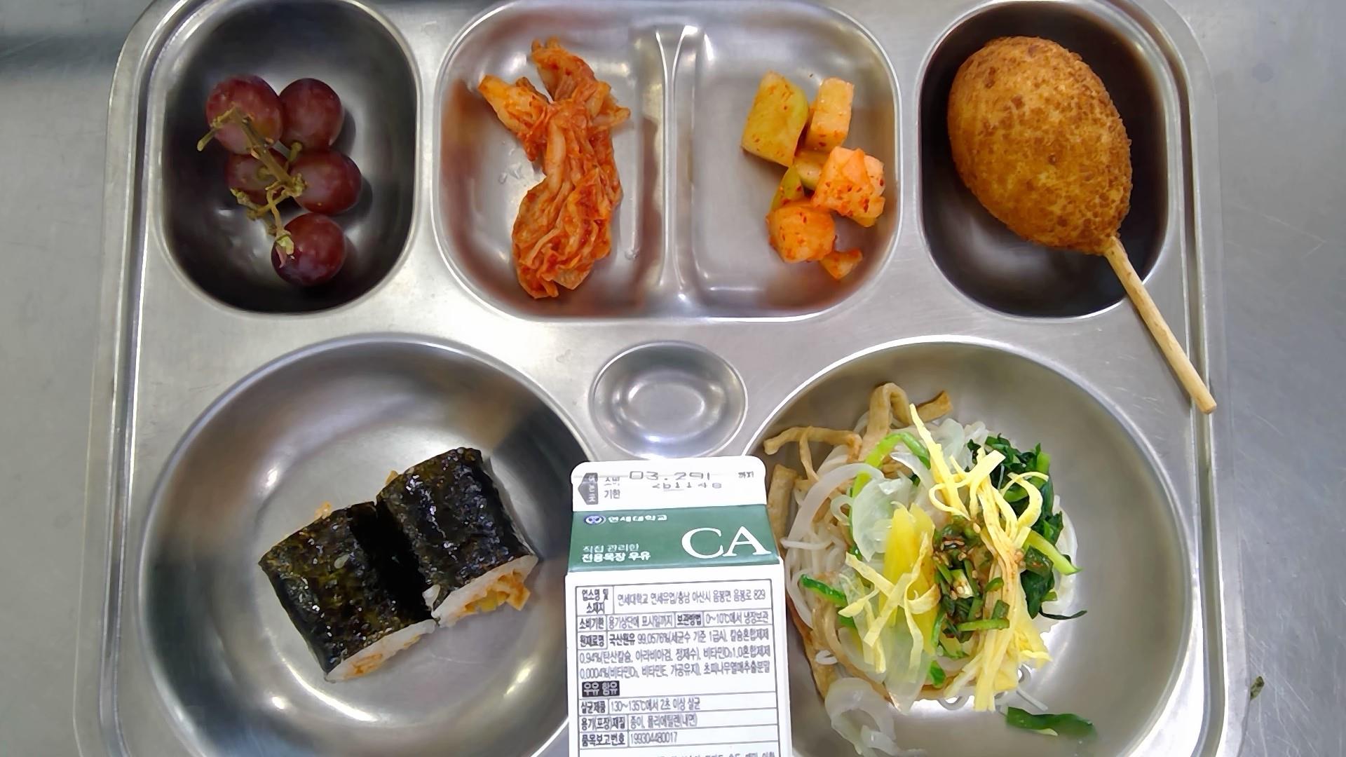 매콤어묵꼬마김밥(1.5.6)잔치국수(1.5.6.8.9.18): 염도 0.6%미니핫도그(1.2.5.6.10.12.15.18)깍두기(9)레드글로브 포도우유(초)(2)* 에너지/단백질/칼슘/철709.1/23.8/257.7/1.9