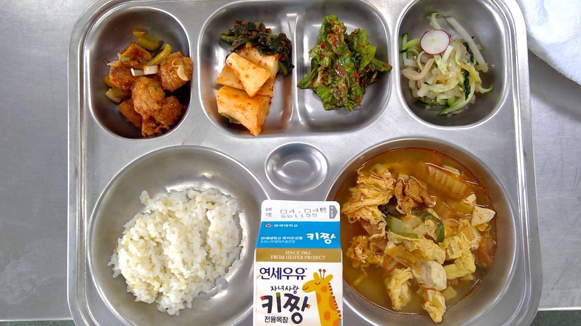 기장밥순두부찌개(1.5.8.9.10.13.18): 염도 0.6%미트볼조림(1.2.5.6.10.12.13.15.16)해파리무침(13)단배추겉절이(자율)(5.6.13)총각김치(9)바나나우유(초)(2)* 에너지/단백질/칼슘/철719.0/26.8/221.7/2.6