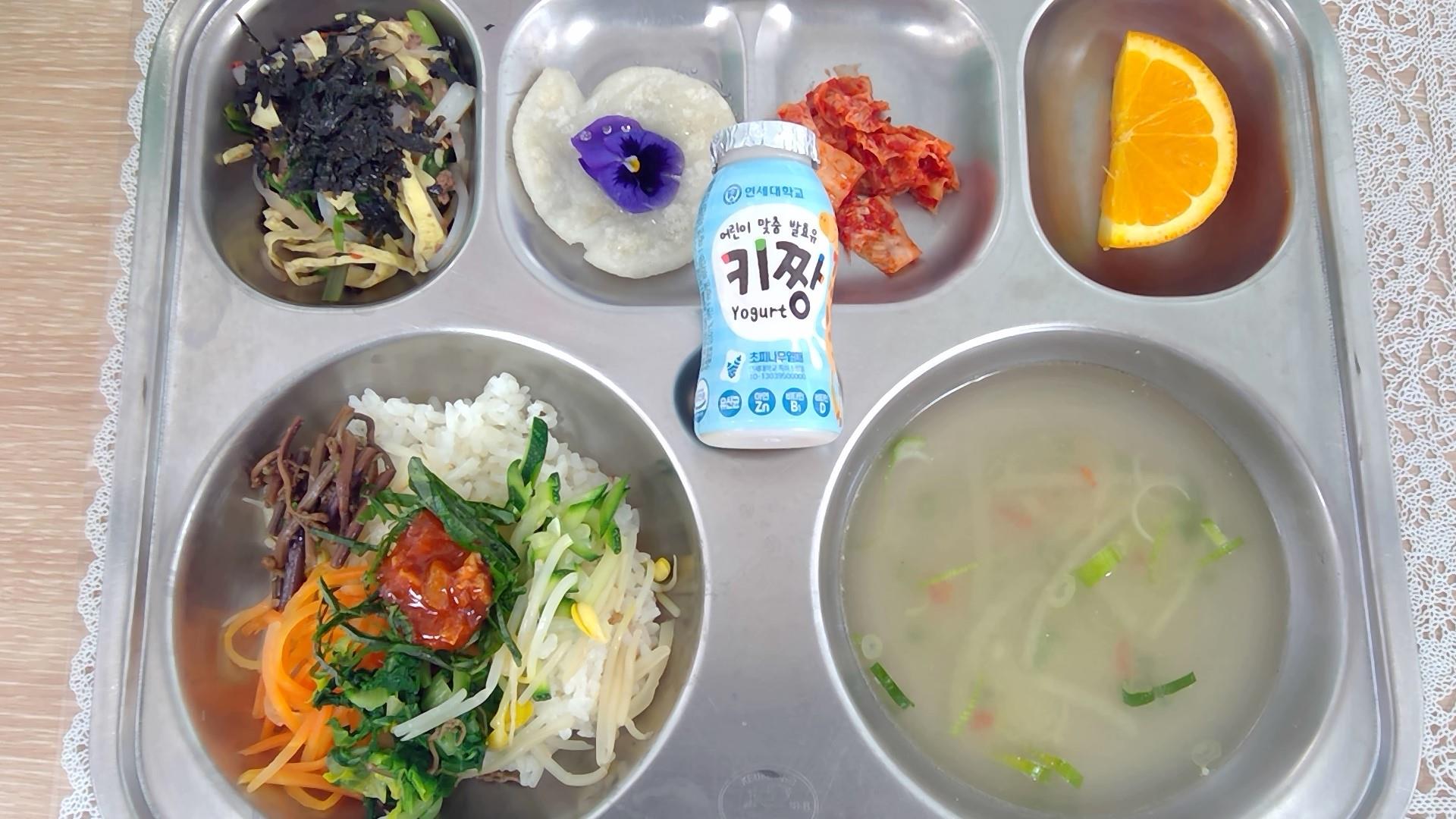 나물비빔밥/약고추장(5.6.10.13)바지락무채국(8.9.18): 염도 0.6%탕평채(1.5.6.13.16)화전배추김치(9)오렌지우유(초)(2)* 에너지/단백질/칼슘/철535.6/17.5/239.9/2.6