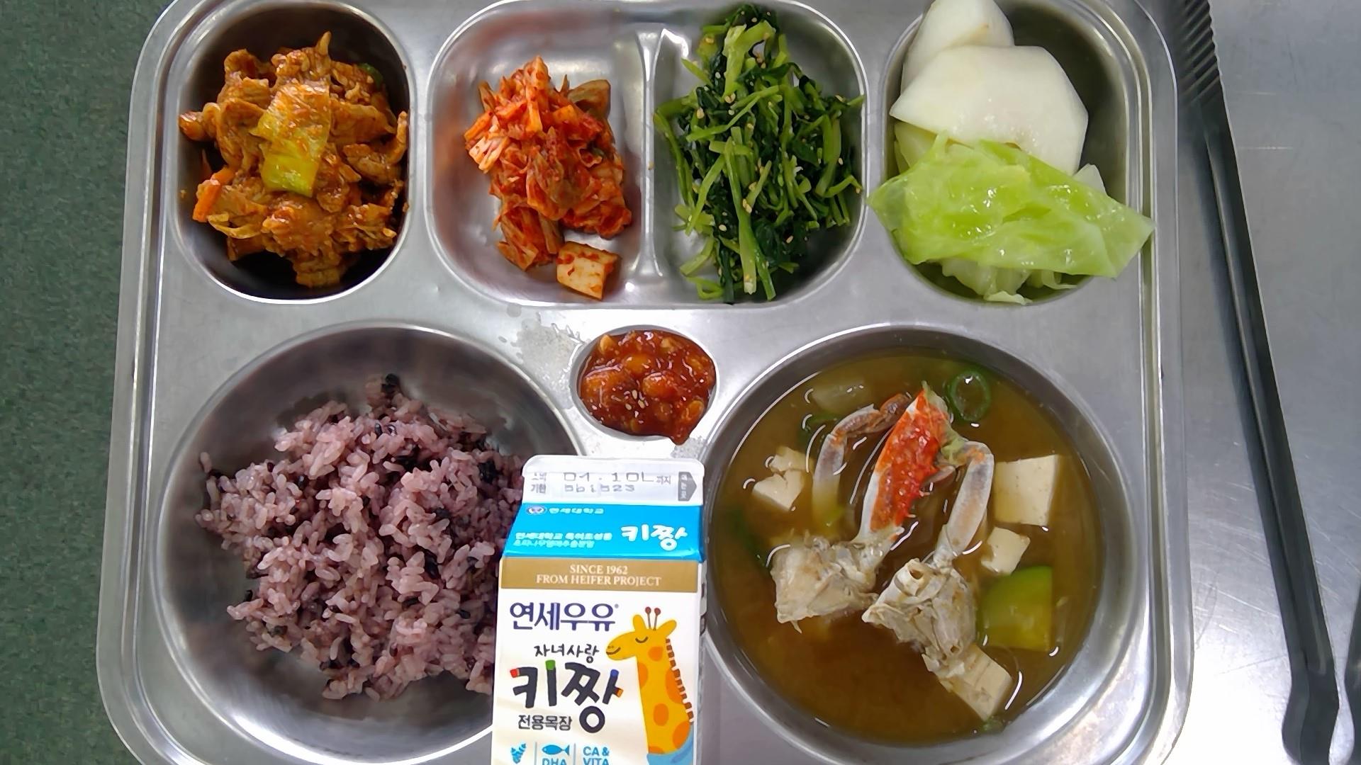 검정쌀밥꽃게탕(5.6.8.9.18): 염도 0.6%제육볶음(5.6.10.13)양배추찜/쌈장(5.6.13)참나물무침(5.6)배추김치(9)파파야멜론우유(초)(2)* 에너지/단백질/칼슘/철638.1/36.5/254.4/3.0