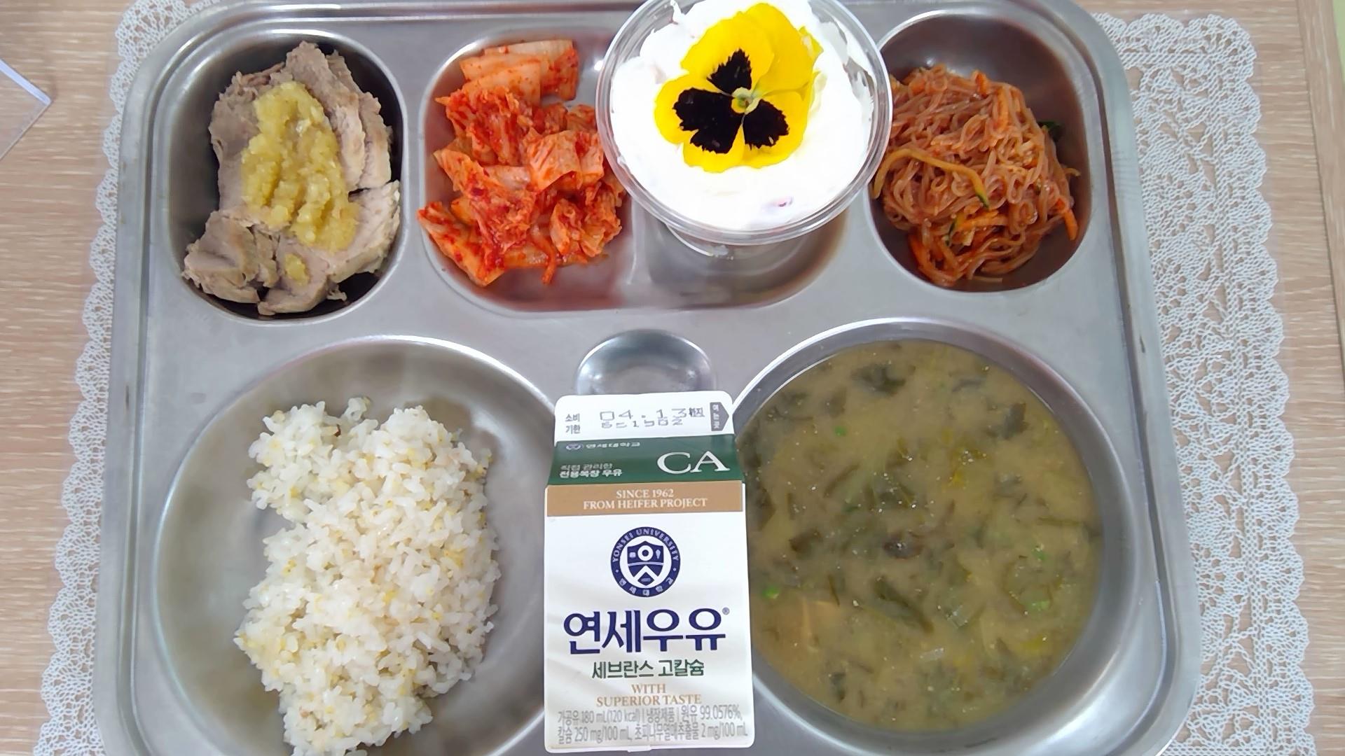 기장밥들깨쑥단배추국(5.6.8.9.18): 염도 0.6%꿀마늘보쌈(5.6.10.12.13.18)새콤달콤비빔냉면(3.5.6.13.16)배추김치(9)화분컵케이크(1.2.5.6.13)우유(초)(2)* 에너지/단백질/칼슘/철873.4/42.1/239.3/4.0