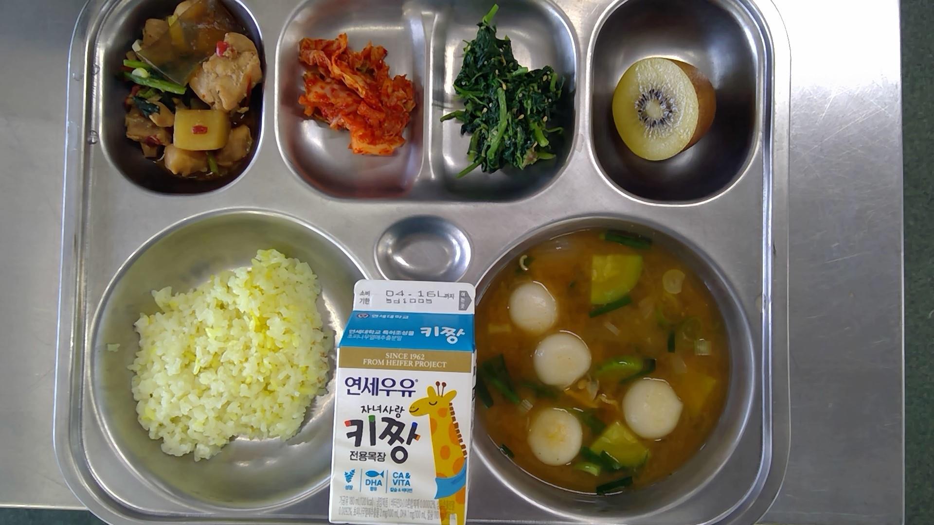 강황쌀밥감자옹심이장국(5.6.17.18): 염도 0.6%안동찜닭(5.6.13.15.16)비름나물무침(5.6)배추김치(9)골든키위(초)우유(초)(2)* 에너지/단백질/칼슘/철633.7/36.1/336.6/5.4
