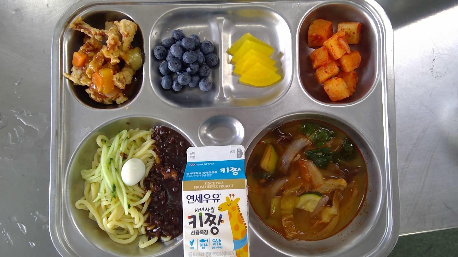 자장면(1.5.6.10.13.16)삼선짬봉국(6.8.9.13.17.18): 염도 0.6%후르츠탕수육(수제)(5.6.10.11.12.13)단무지깍두기(9)친환경블루베리우유(초)(2)* 에너지/단백질/칼슘/철588.1/34.3/246.5/3.0