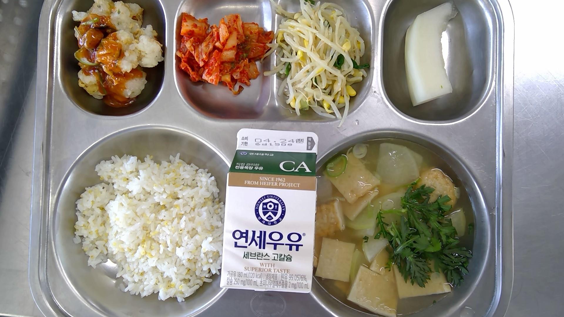 기장밥모듬어묵국(1.5.6.8.9.18): 염도 0.6%마파두부(5.6.10.12.13.18)콩나물무침(5.6)배추김치(9)파파야멜론우유(초)(2)* 에너지/단백질/칼슘/철635.8/30.9/255.4/3.1