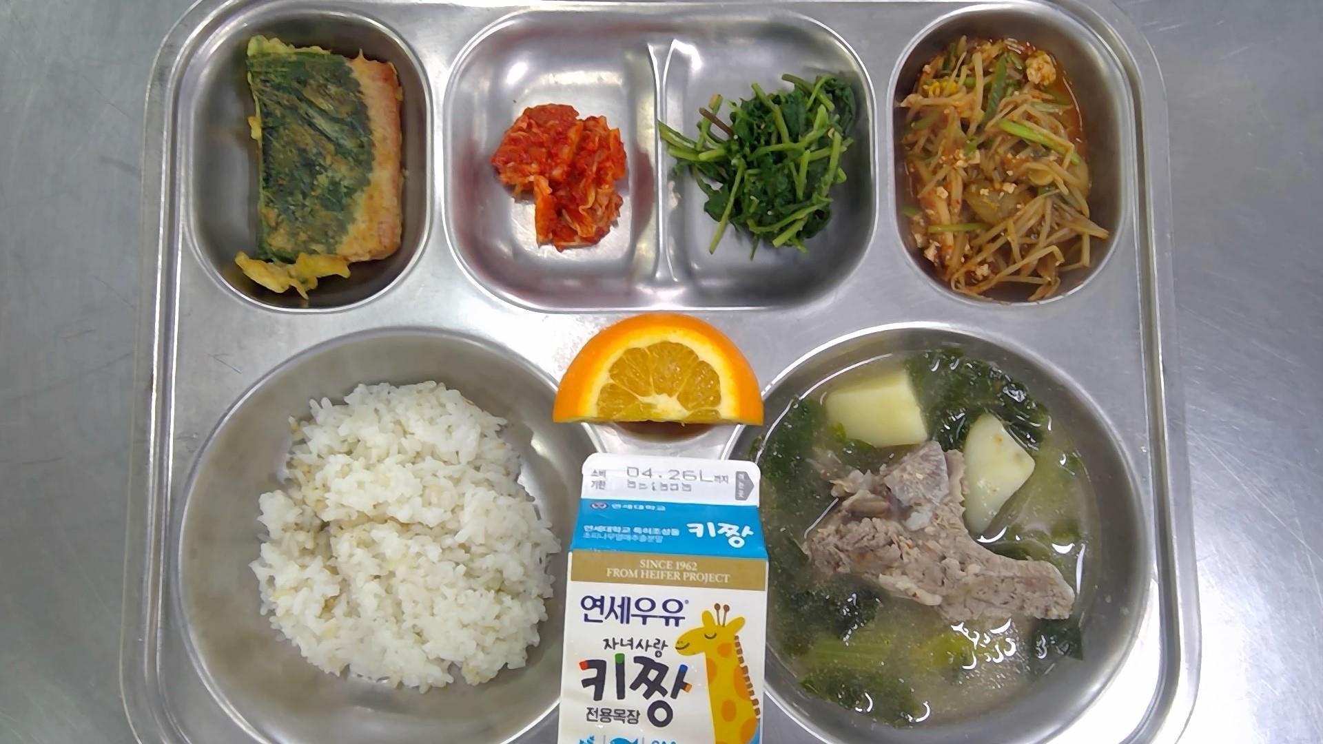 현미쌀밥등뼈감자탕(5.6.8.9.10.18): 염도 0.6%햄깻잎전(1.2.5.6.10.15.16)해물찜(5.9.13.17)취나물된장무침(자율)(5.6)배추김치(9)오렌지우유(초)(2)* 에너지/단백질/칼슘/철814.0/38.1/327.9/3.9