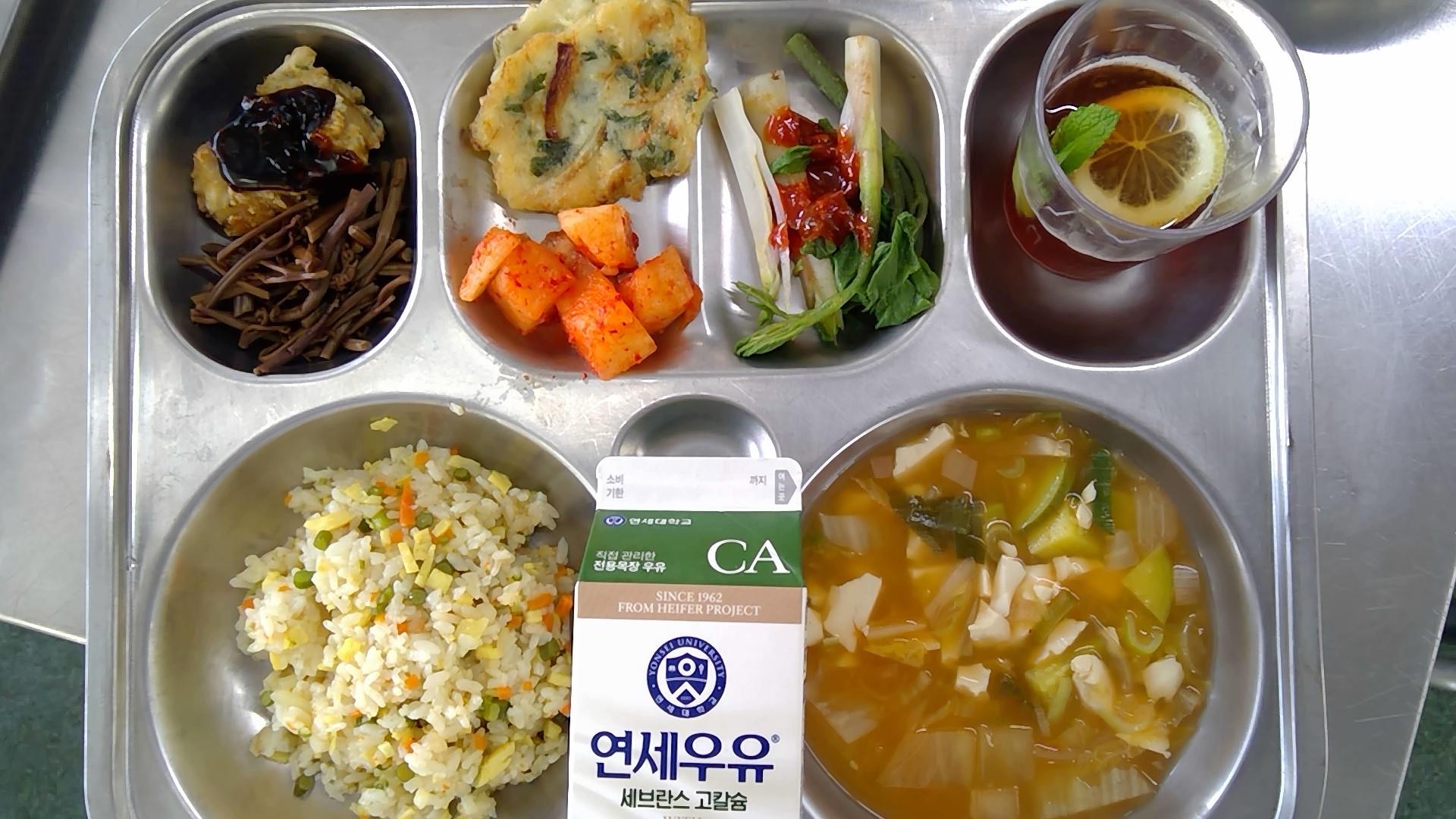 마늘종볶음밥(1.2.5.6.9.13.18)김치순두부국(5.6.9): 염도 0.6%삼치/고사리구이(5.6.13)두릅초무침(5.6.13)깍두기(9)상큼한레몬에이드(초)(13)우유(초)(2)* 에너지/단백질/칼슘/철759.3/31.7/280.8/2.9