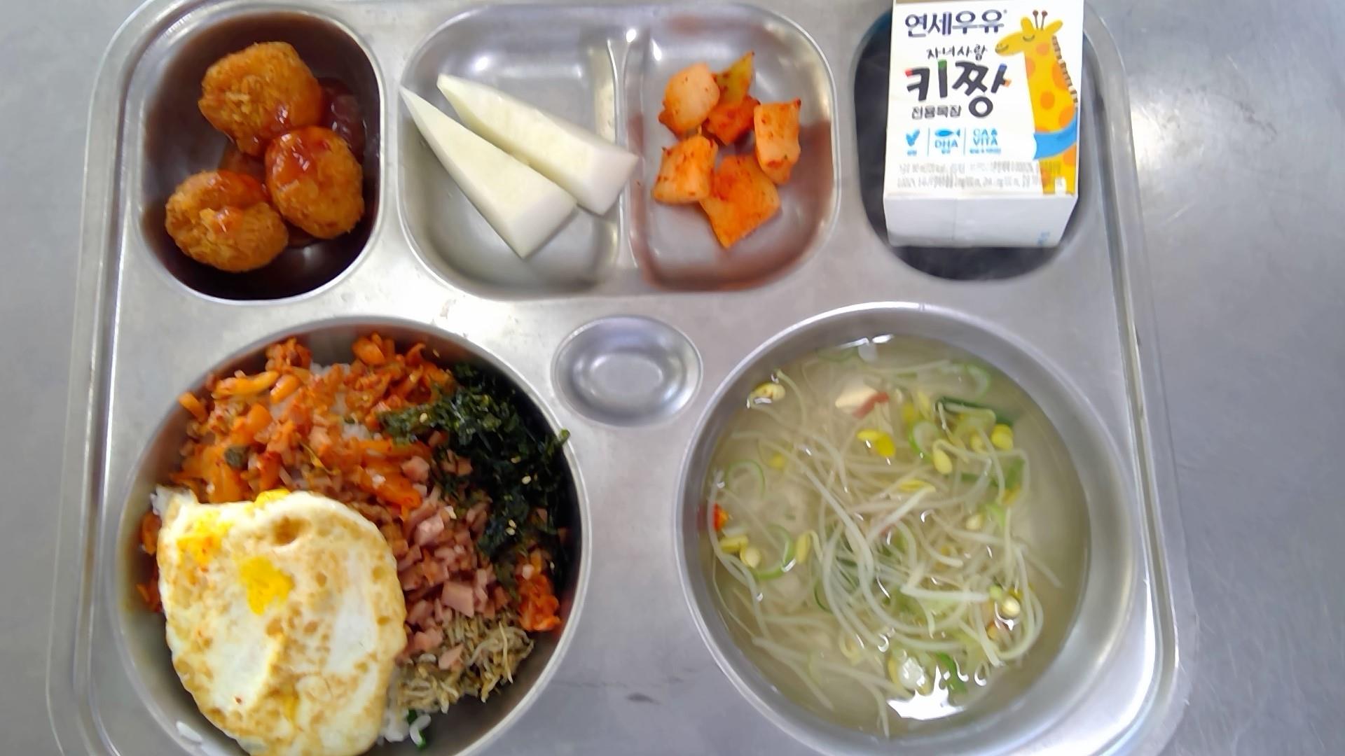 도시락비빔밥(1.2.5.6.9.10.13.15.16)맑은콩나물국(5.6.8.9.18): 염도 0.6%새우볼튀김+칠리소스(1.5.6.9.12.13)깍두기(9)파파야멜론우유(초)(2)* 에너지/단백질/칼슘/철622.9/32.9/304.8/3.2