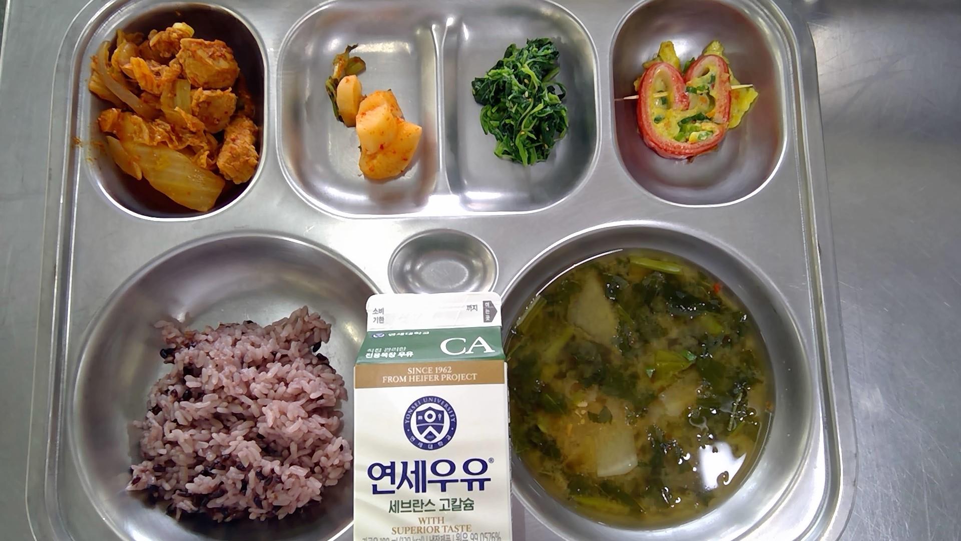 검정쌀밥아욱국(5.6.8.9.18): 염도 0.6%돼지고기김치찜(5.6.9.10.13)사랑해맛살달걀전(1)비름나물무침(자율)(5.6)총각김치(9)골든듀멜론우유(초)(2)* 에너지/단백질/칼슘/철527.5/36.0/319.6/5.9