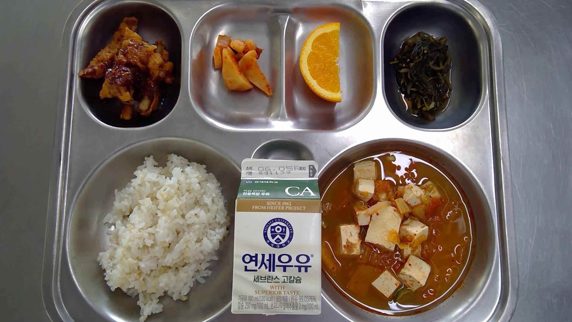 현미쌀밥참치김치찌개(5.8.9.13.18): 염도 0.6%양념고기후라이드(5.6.10.13.18)깻잎순양파볶음(5.6)총각김치(9)오렌지우유(초)(2)* 에너지/단백질/칼슘/철541.9/31.3/306.6/2.5