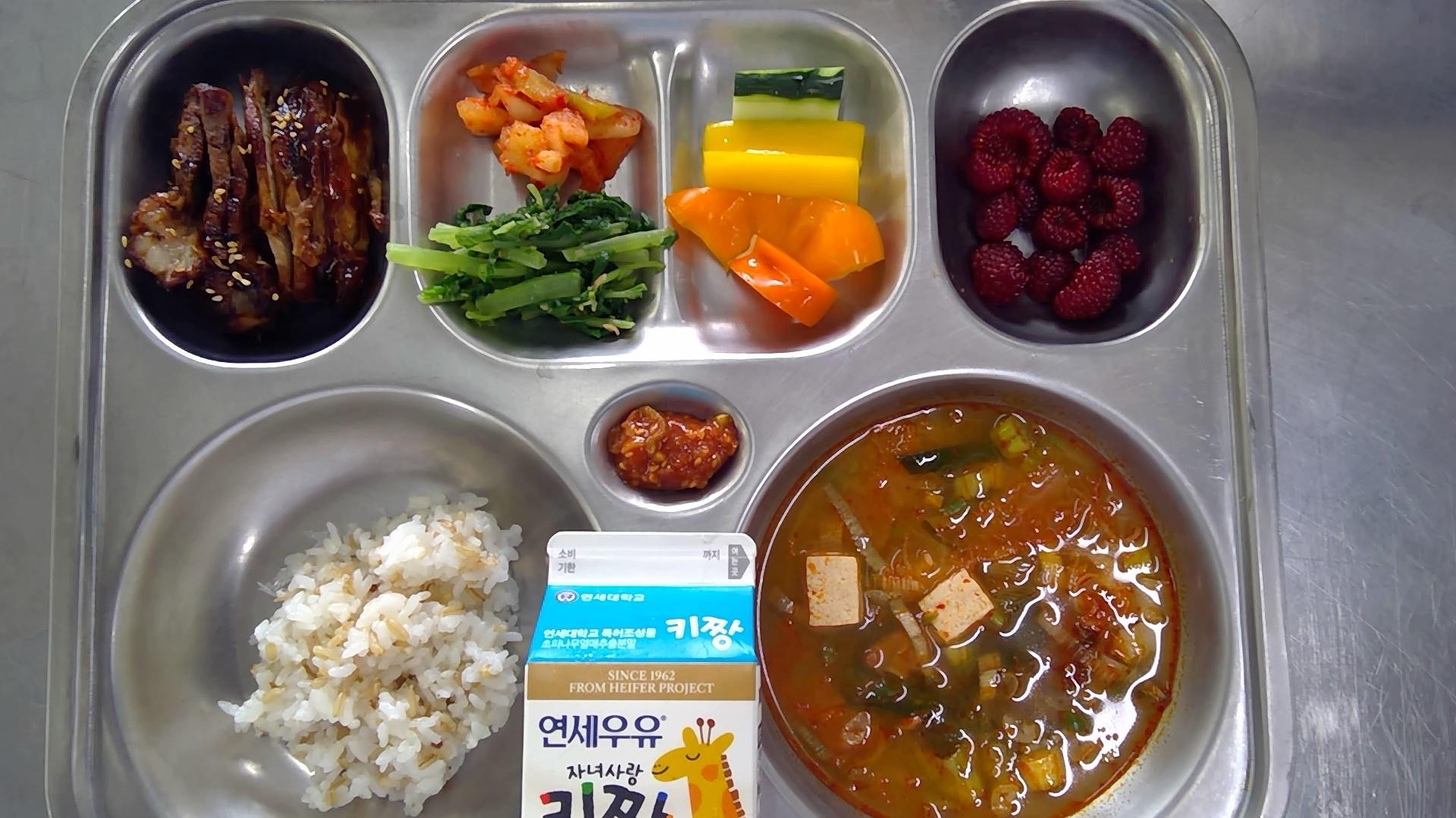 귀리쌀밥참치김치찌개(5.8.9.13.18): 염도 0.6%돼지고기숯불바베큐(5.6.10.12.13)열무된장무침(5.6)채소스틱/땅콩쌈장(4.5.6.13)배추김치(9)산딸기우유(초)(2)* 에너지/단백질/칼슘/철637.6/37.5/239.9/3.0