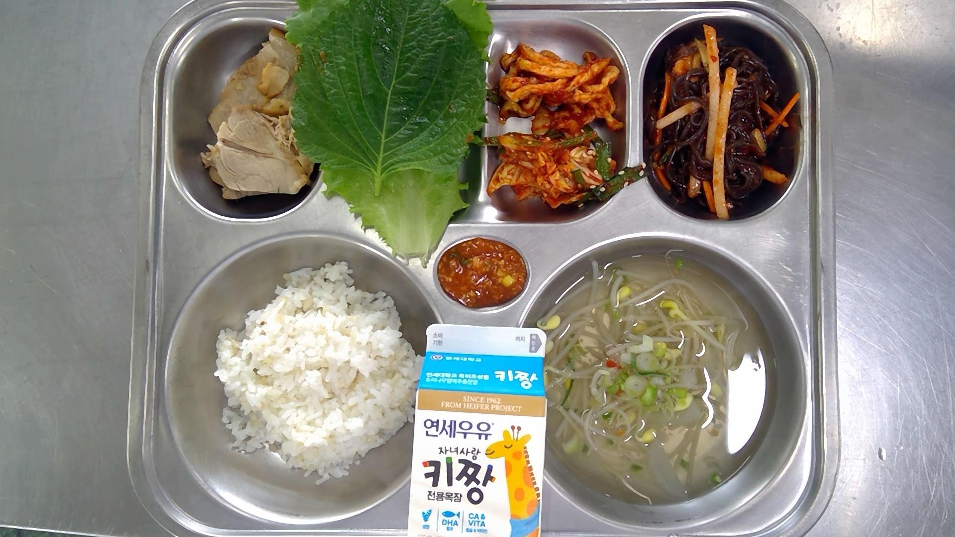 현미쌀밥맑은콩나물국(5.6.8.9.18): 염도 0.6%족발/쌈채소(5.6.10.13)춘천막국수(3.5.6.13.16)무말랭이 김치(자율)담금김치우유(초)(2)* 에너지/단백질/칼슘/철671.8/33.9/267.2/2.4