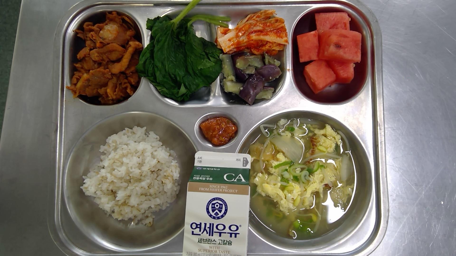 보리밥황태콩나물국(1.5.6.8.9.18): 염도 0.6%돼지고기두루치기(5.6.10.13)가지나물무침호박잎쌈(자율)(5.6)배추김치(9)수박(초)우유(초)(2)* 에너지/단백질/칼슘/철562.5/34.1/258.5/2.8