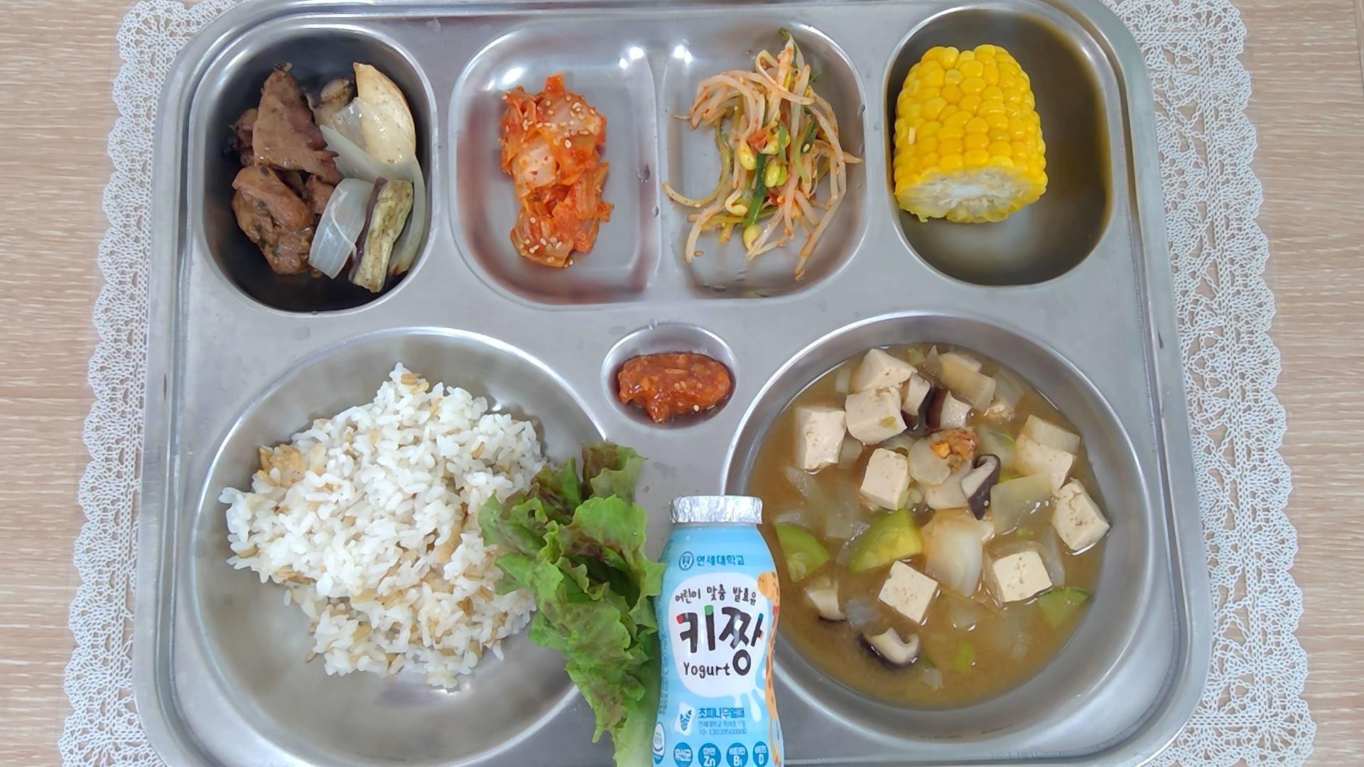 귀리쌀밥미더덕된장국(5.6.8.9.18): 염도 0.6%칠산캠핑구이(5.6.10.13)콩나물파채무침(5.13)볶음김치(9.13)초당옥수수우유(초)(2)* 에너지/단백질/칼슘/철846.0/40.2/236.9/4.0