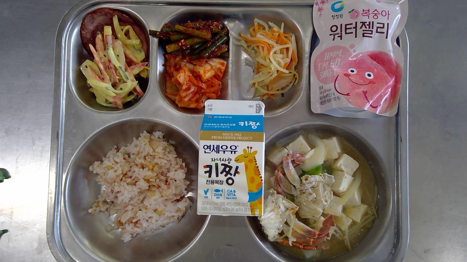 오색현미밥꽃게탕(5.6.8.9.18): 염도 0.6%오리쌈&오절판(1.5.6.8.13)감자채볶음마늘쫑고추장무침(5.6.13)배추김치(9)워터젤리(복숭아)(11)우유(초)(2)* 에너지/단백질/칼슘/철672.2/26.4/244.5/2.1