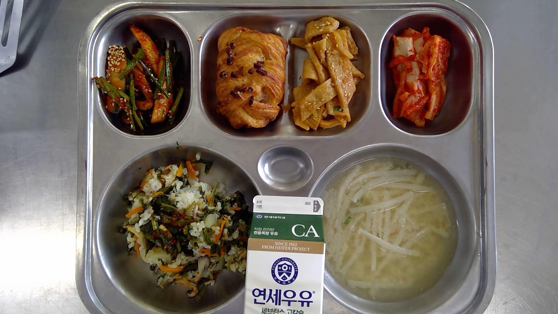 곤드레감자밥/양념장(5.6.13)들깨무채국(8.9.18): 염도 0.6%새송이어묵볶음(1.5.6.13.18)오이부추무침(5.6.13)배추김치(9)메이플피칸파이(1.2.5.6.14)우유(초)(2)* 에너지/단백질/칼슘/철600.9/17.3/319.0/3.2
