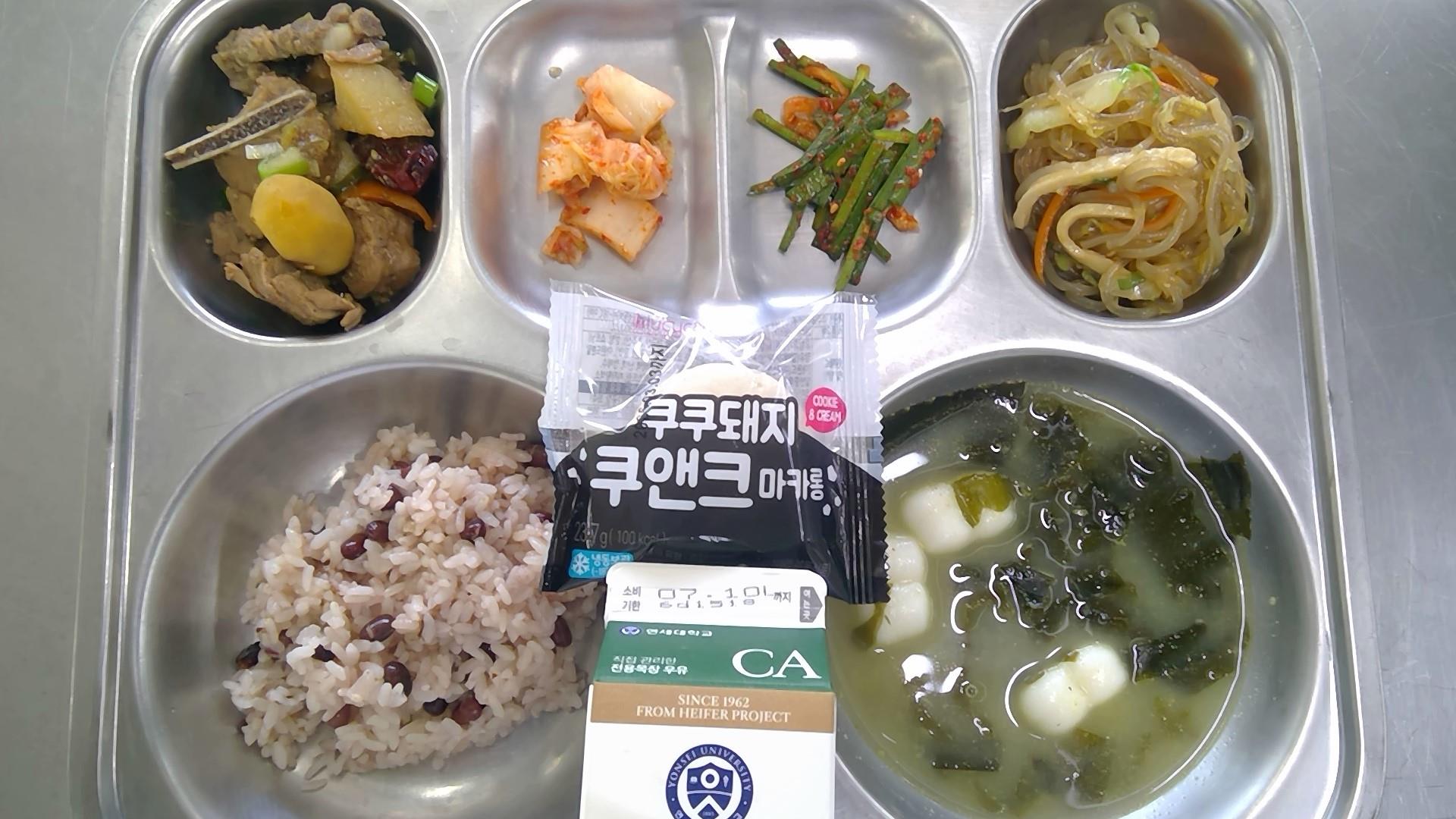 팥밥조랭이떡미역국(5.6.8.9.18): 염도 0.6%전통갈비찜(5.6.10.13)배추잡채볶음(1.5.6.13)부추겉절이(자율)(5.6.13)배추김치(9)쿠앤크 마카롱(1.2.6)우유(초)(2)* 에너지/단백질/칼슘/철787.2/34.7/191.9/4.1