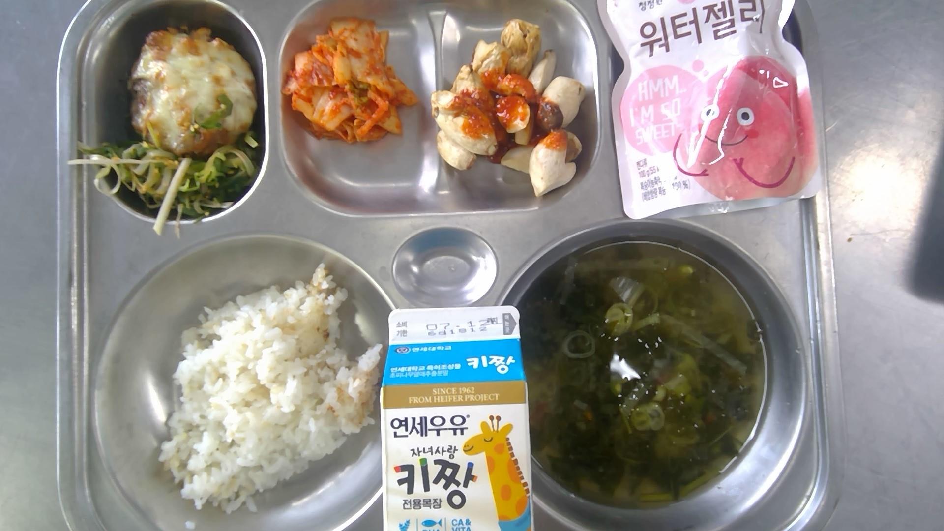 기장밥아욱국(5.6.8.9.18): 염도 0.6%치즈석쇠불고기/파채(2.5.6.9.10.13.16)새송이버섯초무침(5.6.13)병아리콩샐러드(자율)(12.13)배추김치(9) / 워터젤리(복숭아)(11)우유(초)(2)* 에너지/단백질/칼슘/철595.5/30.4/206.7/3.0