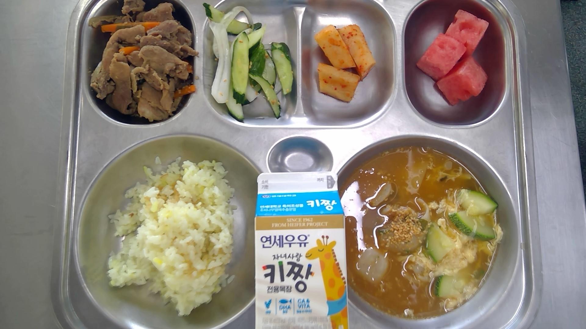 강황쌀밥참깨수제비국(1.2.5.6.8.9.10.13.15.16.18): 염도 0.6%돼지고기불고기볶음(5.6.10.13)오이양파무침(5.6.13)총각김치(9)수박(초)우유(초)(2)* 에너지/단백질/칼슘/철651.3/34.6/151.2/2.4