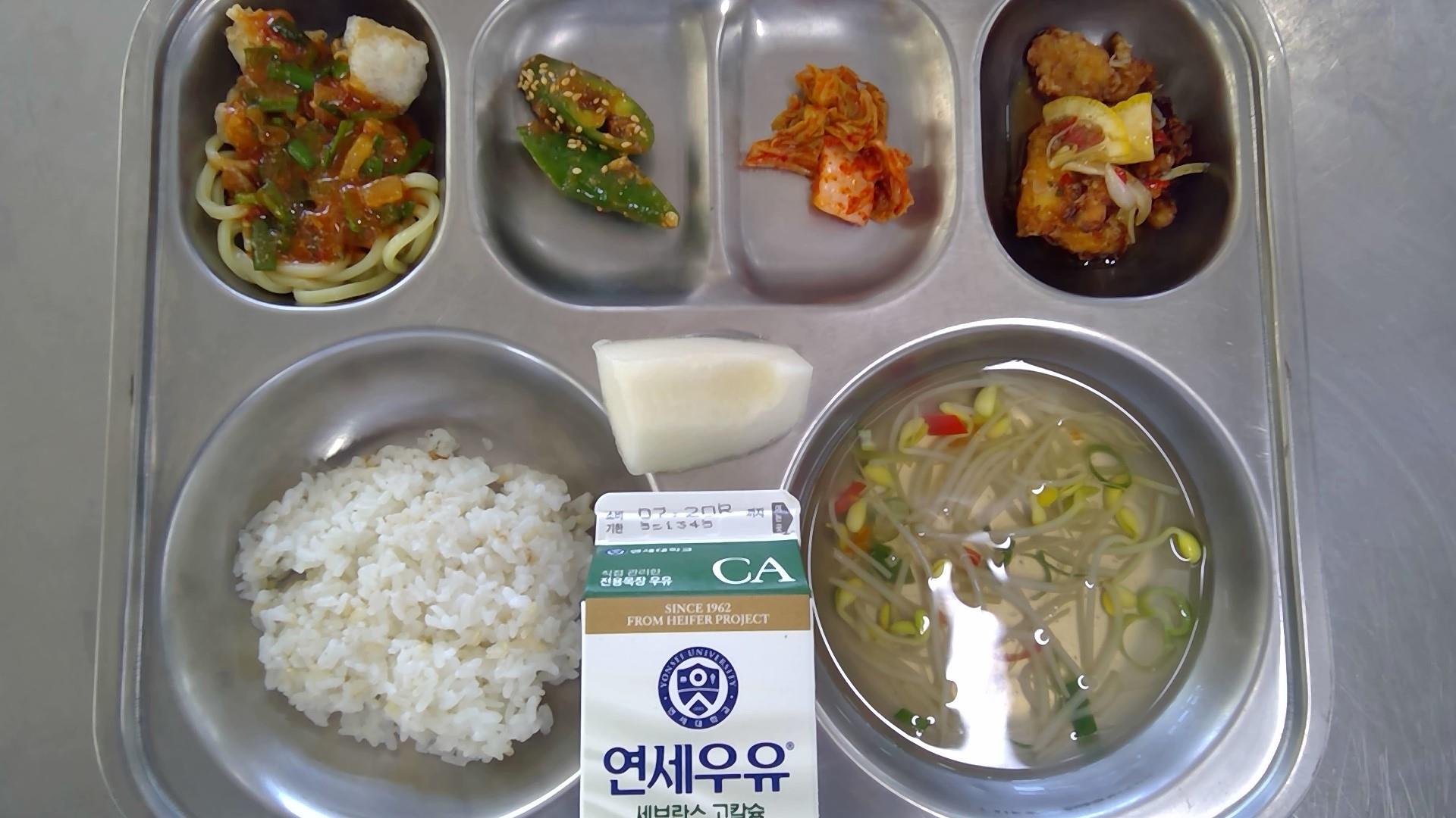 현미쌀밥맑은콩나물국(5.6.8.9.18): 염도 0.6%마파두부면(5.6.10.12.13.18)가자미유린기(6.13)아삭고추된장무침(자율)(1.5.6.13)배추김치(9)참외우유(초)(2)* 에너지/단백질/칼슘/철638.6/37.6/188.5/3.0