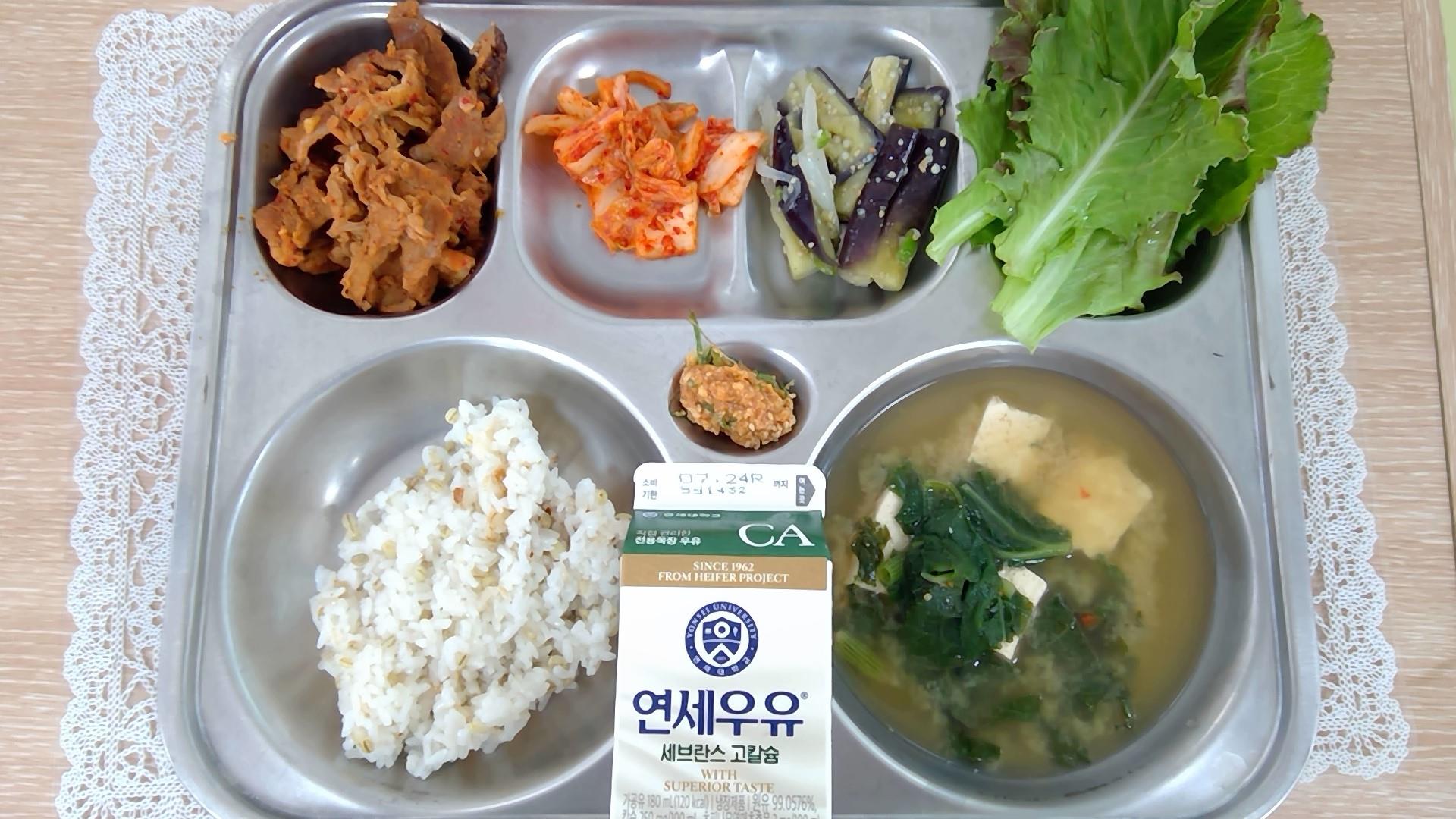 보리밥호박잎된장국(5.6.8.9.18): 염도 0.6%밀양파불고기(초)(5.6.10.13)가지나물무침상추쌈/두부쌈장(5.6.13)배추김치(9)우유(초)(2)* 에너지/단백질/칼슘/철621.6/35.9/201.1/4.6