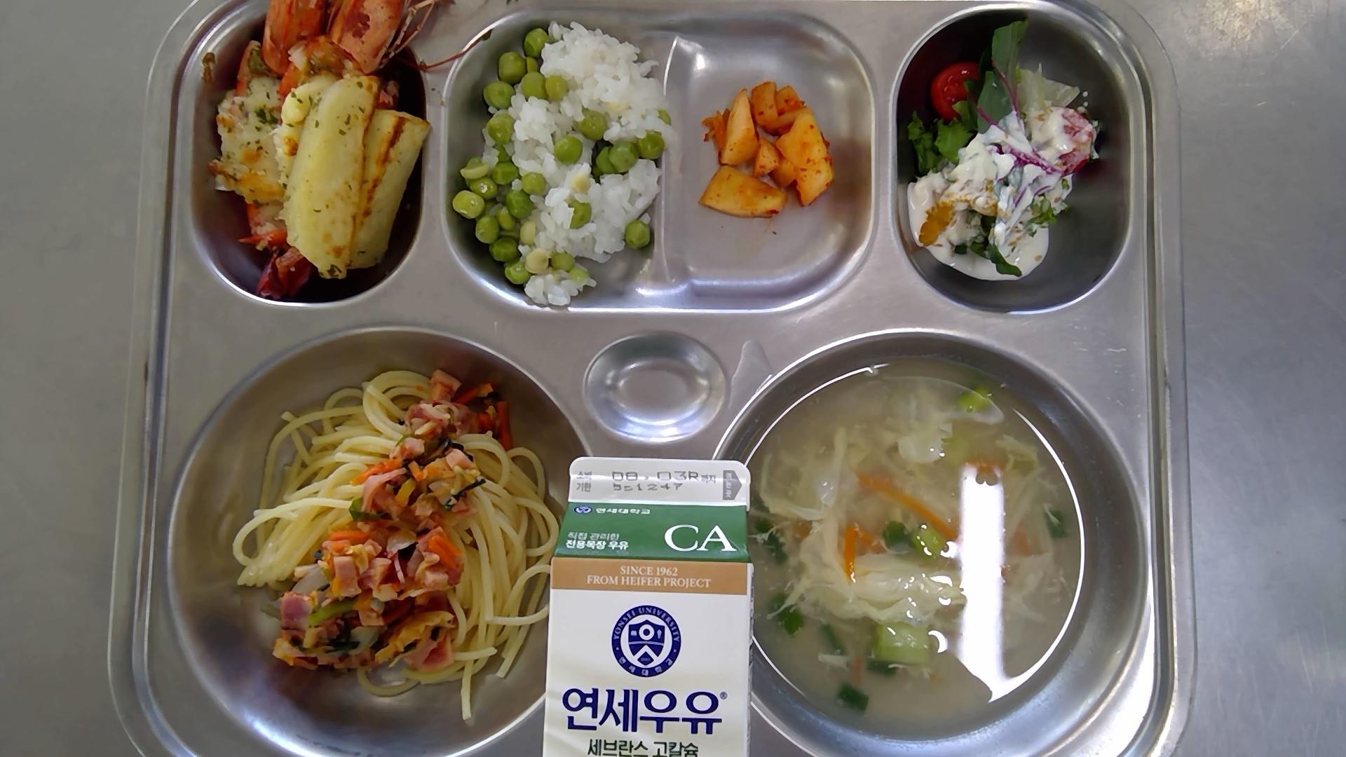 완두콩밥(적은밥)게맛살달걀탕(1): 0.6%볶음김치파스타(1.2.5.6.9.10.13.15.16)새우치즈구이/웨지감자(수제)(1.2.5.9.13)만다린샐러드(1.2.5.12.13)깍두기(9) / 우유(초)(2)* 에너지/단백질/칼슘/철685.0/31.8/324.7/4.3