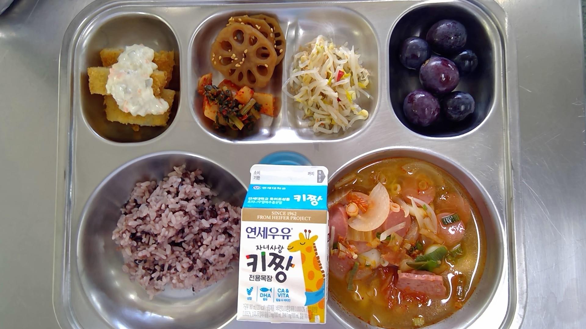 검정쌀밥부대찌개(1.2.5.6.8.9.10.15.16.18): 염도 0.6%생선까스/타르소스(1.5.6.13)숙주나물무침(5.6.18)연근조림(자율)(5.6.13)총각김치(9)거봉우유(초)(2)* 에너지/단백질/칼슘/철649.1/26.5/207.5/2.6