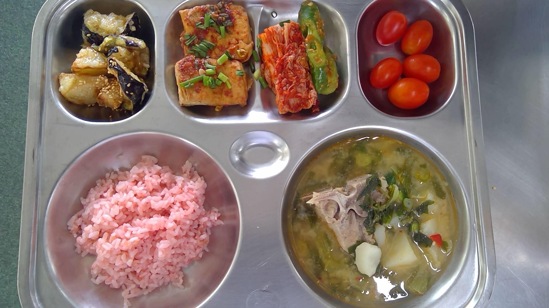 홍국쌀밥등뼈감자탕(5.6.8.9.10.18): 염도 0.6%두부양념조림(5.6.13)지삼선(5.6.13.18)아삭고추된장무침(자율)(1.5.6.13)배추김치(9)대추방울토마토(12)우유(초)(2)* 에너지/단백질/칼슘/철730.6/35.0/252.2/3.9