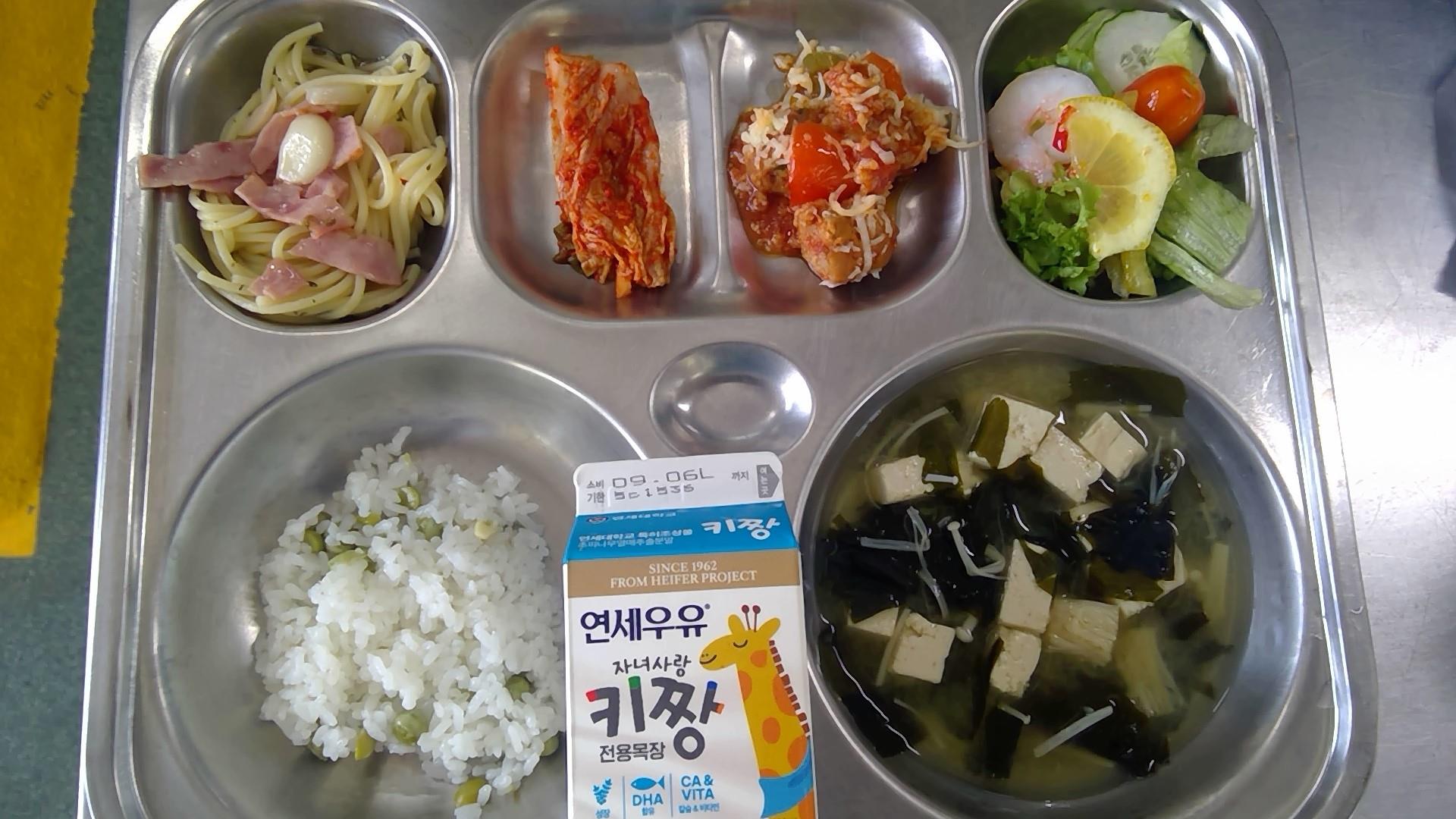 완두콩밥(적은밥)미소장국(5.6.8.9.18)베이컨알리오올리오파스타(1.5.6.10.13)미트볼라따뚜이(1.2.5.6.10.12.13.15.16)유자얌운센샐러드(1.2.5.6.9.12.13)배추김치(9) / 우유(초)(2)* 에너지/단백질/칼슘/철686.5/29.0/171.5/3.0