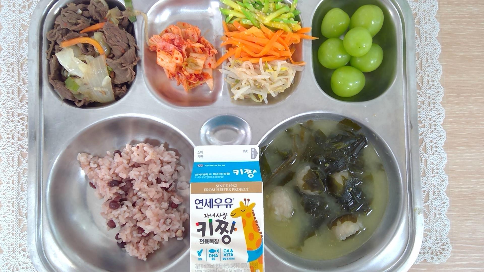 팥밥옹심이들깨미역국(5.6.8.9.17.18): 염도 0.6%한우불고기볶음(5.6.13.16)삼색나물(5.6)배추김치(9)샤인머스캣우유(초)(2)* 에너지/단백질/칼슘/철620.1/36.3/158.2/4.7