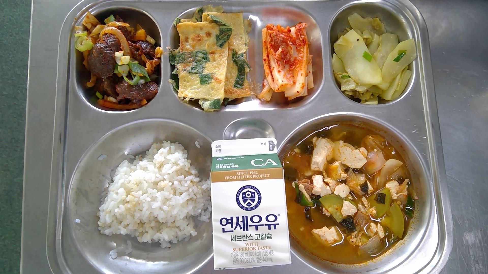 현미쌀밥순두부찌개(1.5.8.9.10.13.18); 염도 0.6%순대볶음(2.5.6.10.13.16)깻잎어묵전(1.5.6)박나물볶음(자율)(18)배추김치(9)우유(초)(2)* 에너지/단백질/칼슘/철608.7/22.7/172.3/5.1