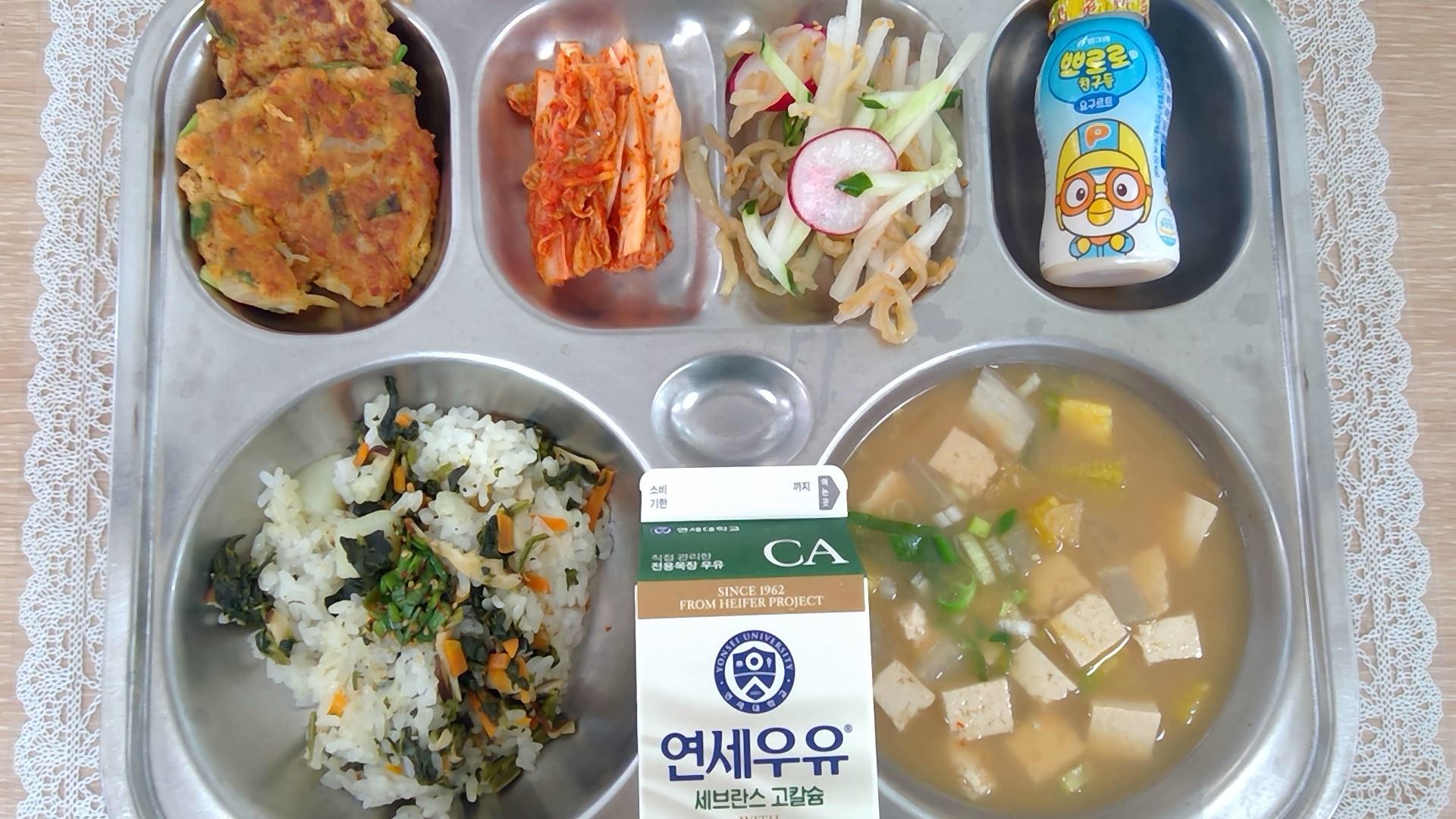 곤드레감자밥/양념장(5.6.13)청국장찌개(5.6.8.9.10.18): 염도 0.6%녹두빈대떡(5.6.9.10)해파리무침(13)배추김치(9)요구르트(2)우유(초)(2)* 에너지/단백질/칼슘/철631.4/25.0/294.8/4.7