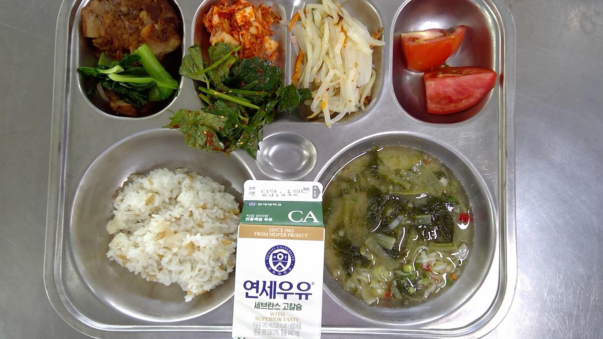 귀리쌀밥시락국(5.6.8.9.18): 염도 0.6%동파육/청경채(5.6.10.13)감자채볶음참나물부추겉절이(자율)(5.6.13.18)배추김치(9)토마토꿀절임(12)우유(초)(2)* 에너지/단백질/칼슘/철620.4/34.3/253.6/3.2