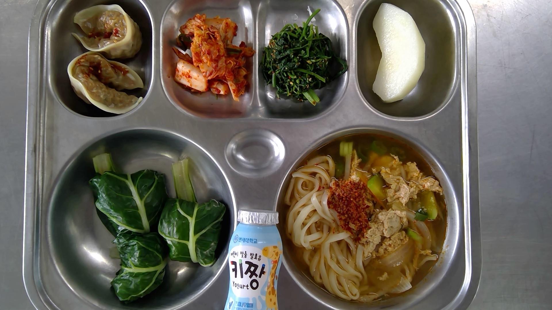 근대쌈밥베테랑칼국수(1.5.6.8.9.18): 염도 0.6%갈비만두/양념장(1.5.6.10.13.16.18)고춧잎무침(자율)(5.6)담금김치배우유(초)(2)* 에너지/단백질/칼슘/철753.7/22.1/256.7/3.8
