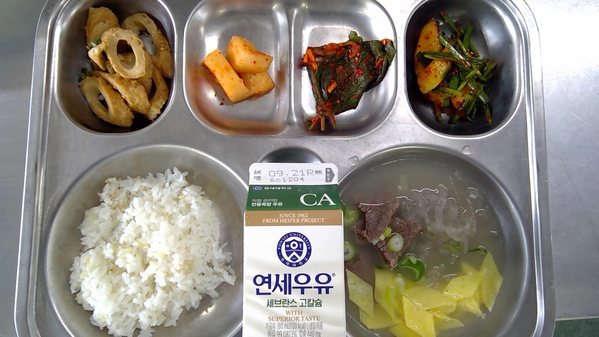 현미쌀밥한우사골곰탕/당면사리(1.16): 염도 0.6%부들어묵볶음(1.5.6)오이부추무침(5.6.13)양념깻잎지(수제)(2.5.6.9.13.18)석박지(9)우유(초)(2)* 에너지/단백질/칼슘/철676.1/29.5/150.7/4.3