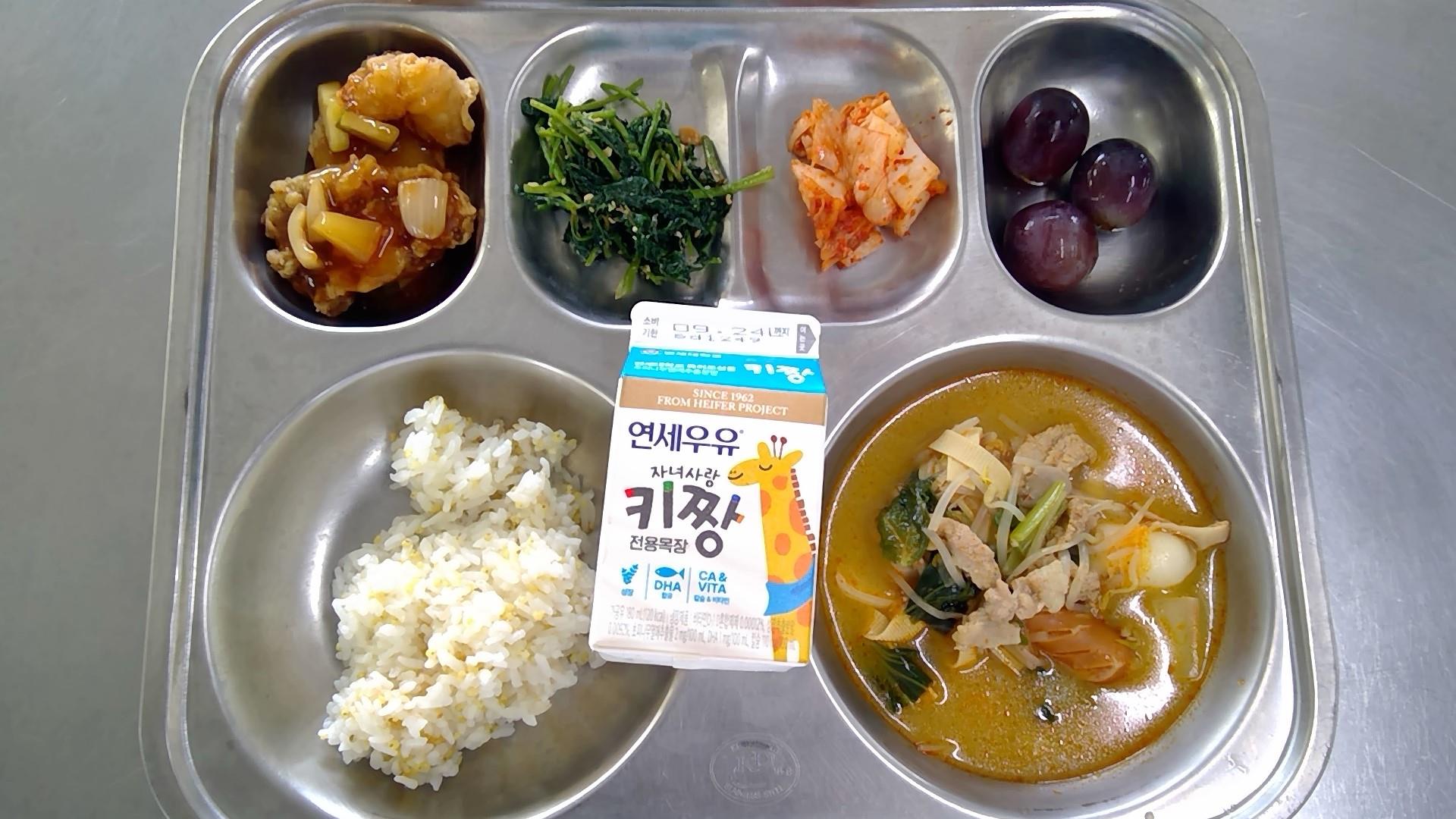 기장밥마라탕/배춧국(선택급식): 염도 0.6%(2.5.6.9.10.13.15.16.17.18)꿔바로우(1.5.6.10.11.12.13)참나물된장무침(5.6)배추김치(9)거봉우유(초)(2)* 에너지/단백질/칼슘/철792.4/22.7/252.2/2.9