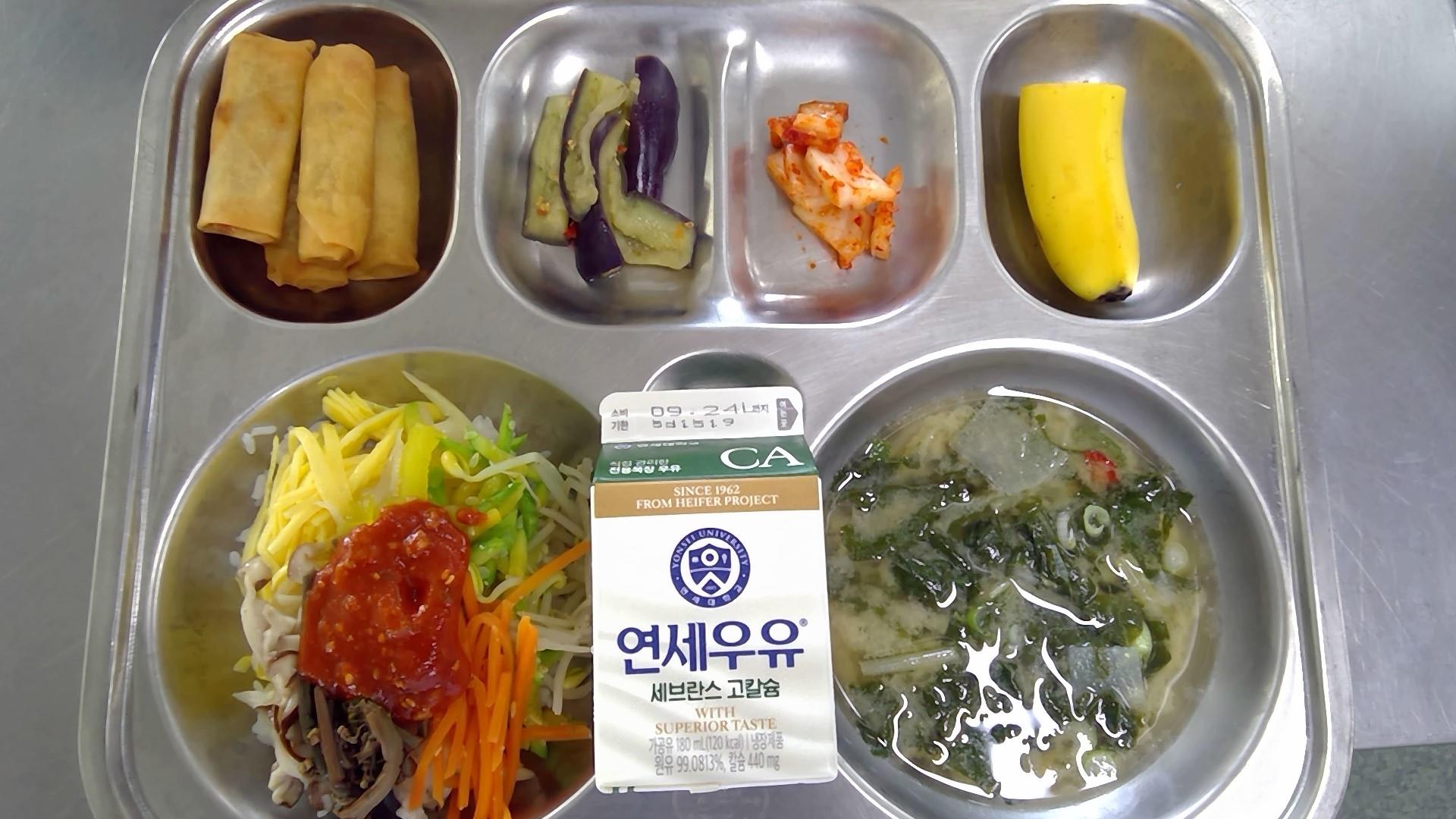 전주비빔밥/약고추장(5.6.10.13)근대된장국(5.6.8.9.18): 염도 0.6%춘권(1.5.6.10)가지나물무침(자율)배추김치(9)바나나우유(초)(2)* 에너지/단백질/칼슘/철558.7/18.3/157.1/2.6