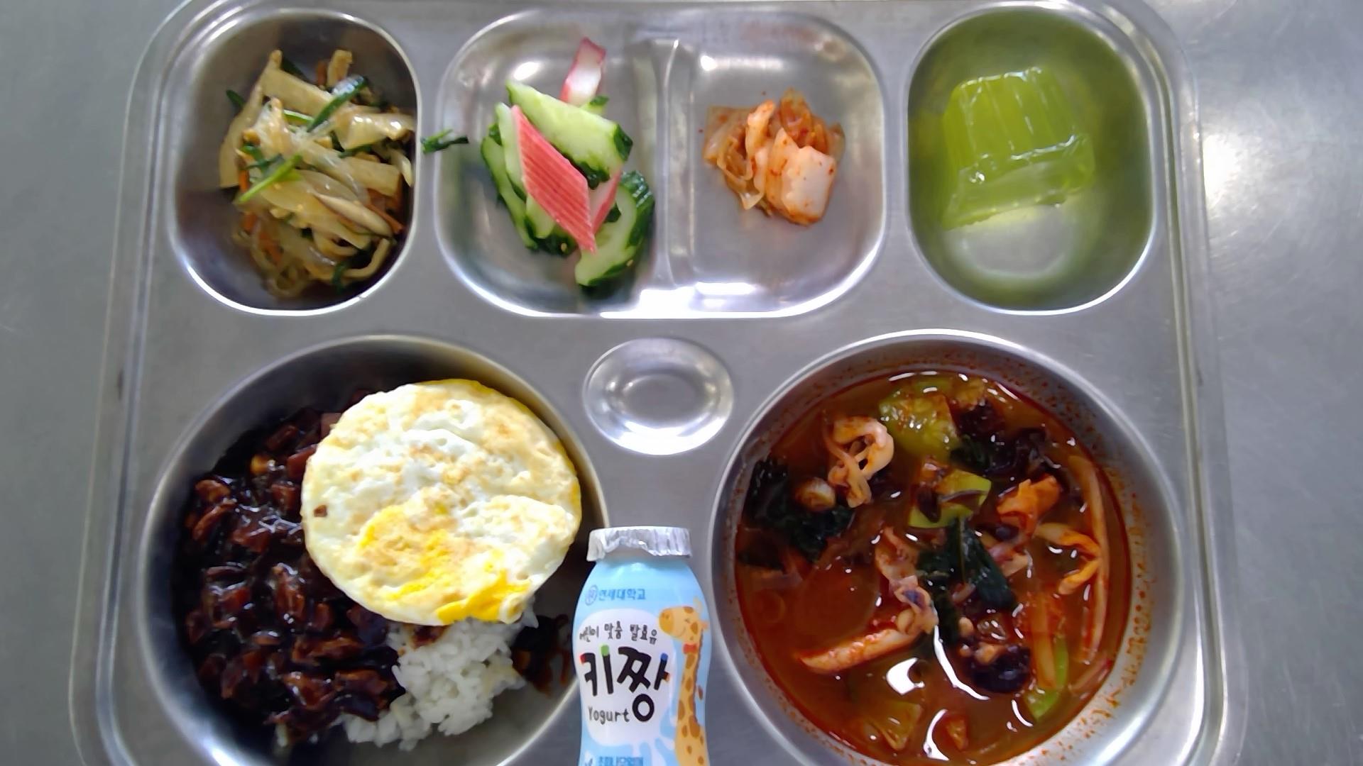 자장밥/달걀후라이(1.5.6.10.13.16)삼선짬봉국(6.8.9.13.17.18): 염도 0.6%부추잡채(1.5.6.13)오이맛살무침(13)배추김치(9)푸딩(샤인머스캣)우유(초)(2)* 에너지/단백질/칼슘/철593.2/27.2/197.6/5.6