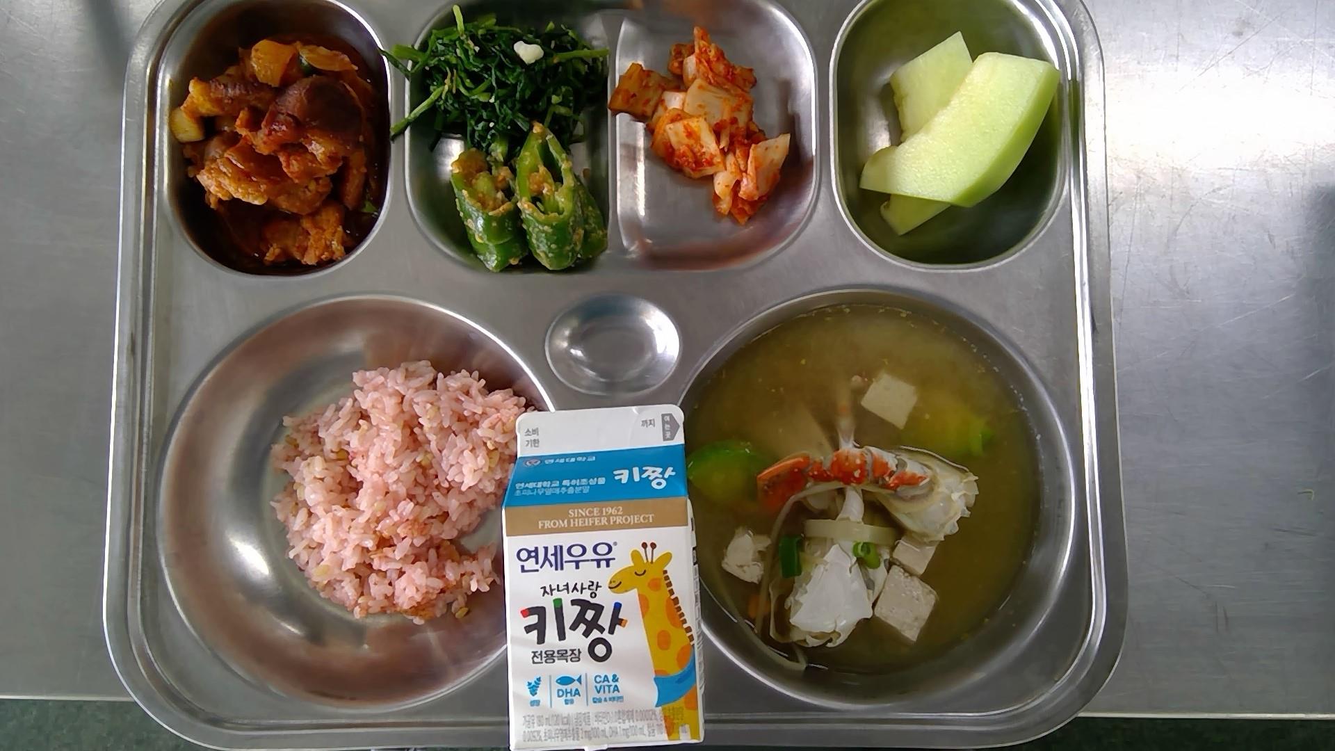 오색현미밥꽃게탕(5.6.8.9.18): 염도 0.6%돼지고기양념구이(5.6.10.12.13.16)부추나물무침(5.6.13)아삭고추된장무침(자율)(1.5.6.13)배추김치(9)머스크 멜론 / 우유(초)(2)* 에너지/단백질/칼슘/철616.1/37.0/143.9/3.6