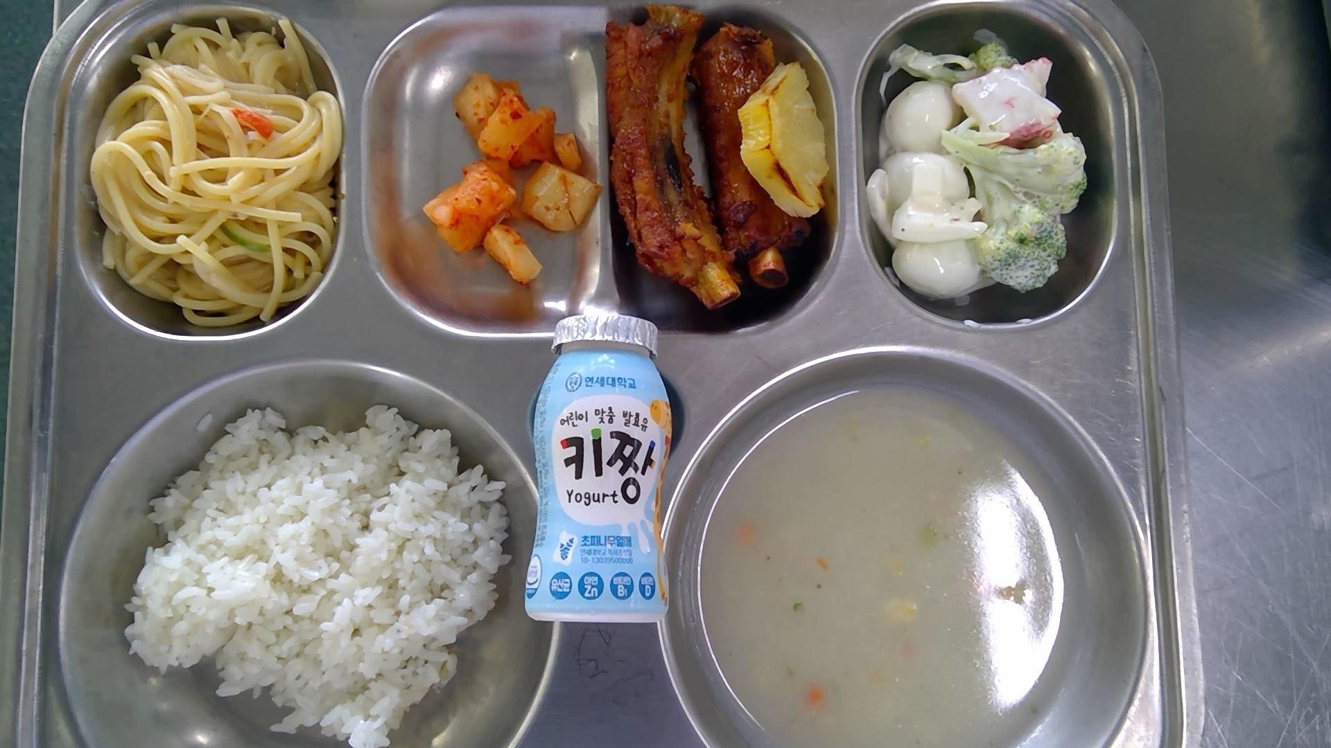 채소스프(2.5.6.13.16.18): 염도 0.6%오이스터파스타(1.2.5.6.13.16)바베큐폭립/구운파인애플(5.6.10.12.13)맛살브로콜리샐러드(1.2.5.6.8.13.18)깍두기(9)우유(초)(2)* 에너지/단백질/칼슘/철869.6/40.3/189.0/5.6