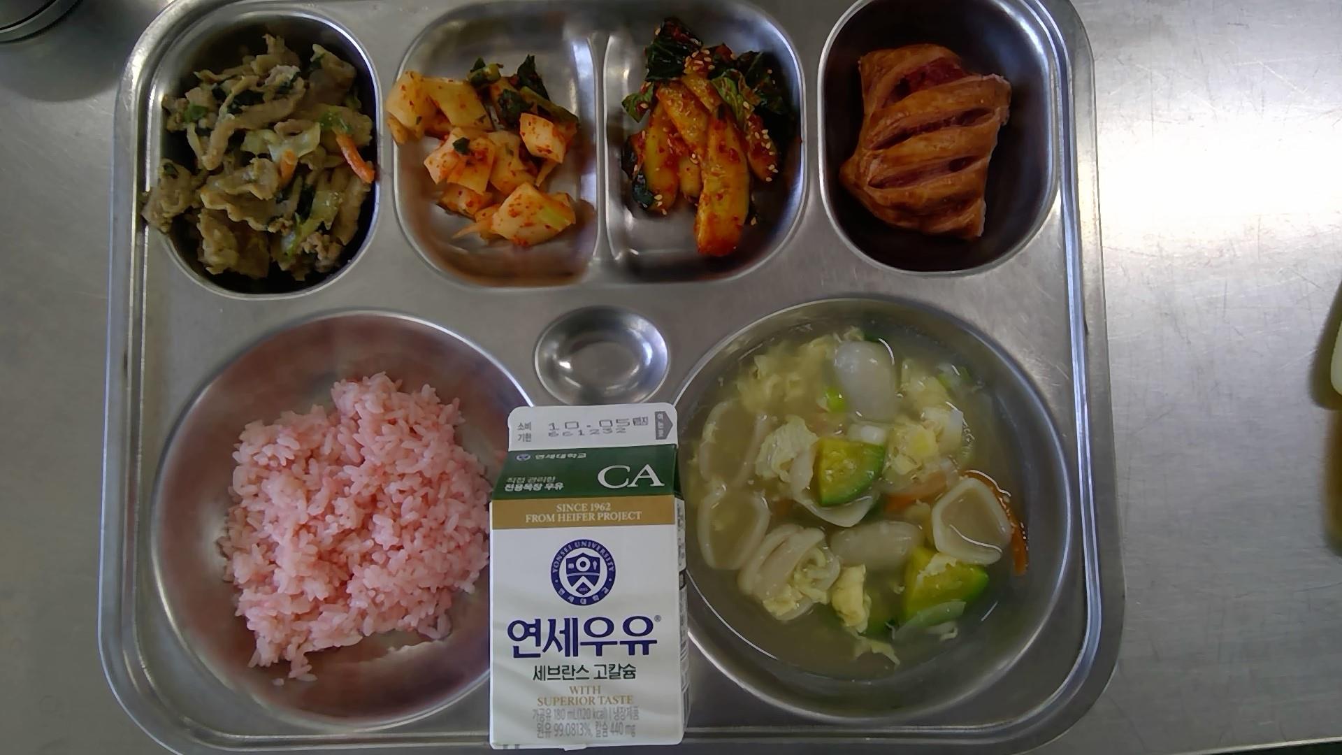 홍국쌀밥해물수제비국(1.5.6.8.9.13.17.18): 염도 0.6%들깨백불고기(5.6.10.13)청경채오이무침(13)총각김치(9)딸기쨈파이(1.2.5.6)우유(초)(2)* 에너지/단백질/칼슘/철712.3/35.0/138.1/3.0