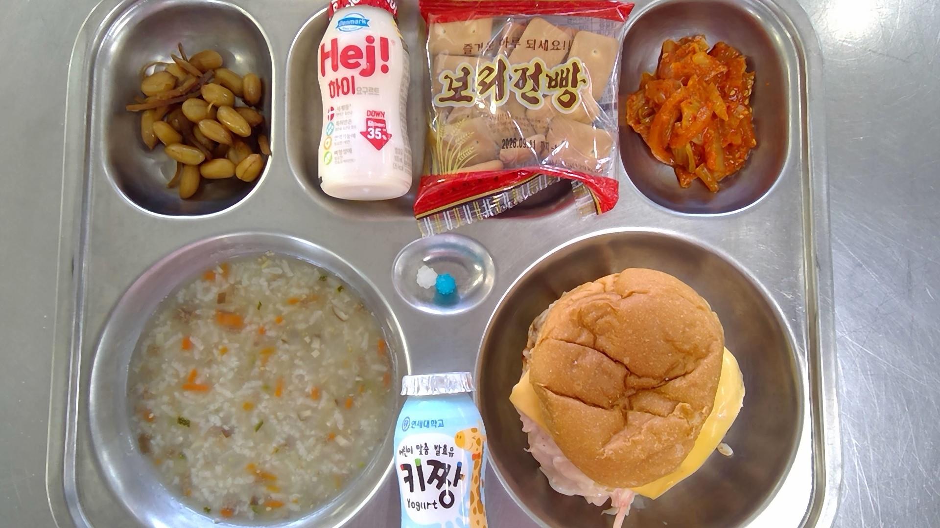 군대리아(1.2.5.6.10.12.13.15.16.18)쇠고기야채죽(16): 염도 0.6%우엉땅콩조림(4.5.6.13)볶음김치(9.13)건빵(2.5.6)저당요구르트(2)우유(초)(2)* 에너지/단백질/칼슘/철852.91/27.26/349.81/4.21