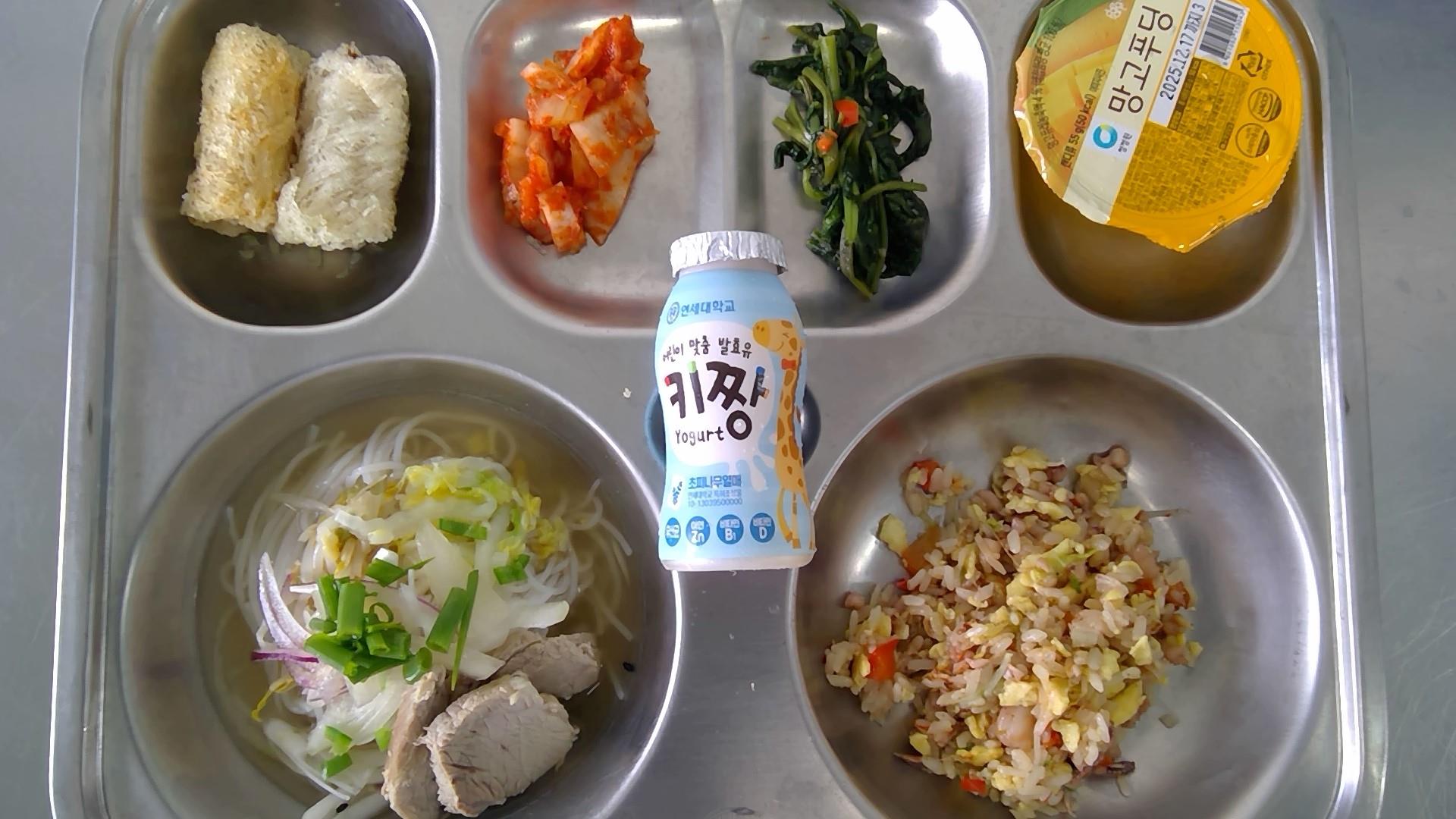 나시고랭볶음밥(1.5.6.9.13.16.17.18)베트남쌀국수(5.6.10.13.15.16.18): 염도 0.6%스프링롤(1.5.6.10)공심채(모닝글로리)볶음(5.6.13.18)배추김치(9)망고푸딩우유(초)(2)* 에너지/단백질/칼슘/철946.93/40.73/202.24/4.36