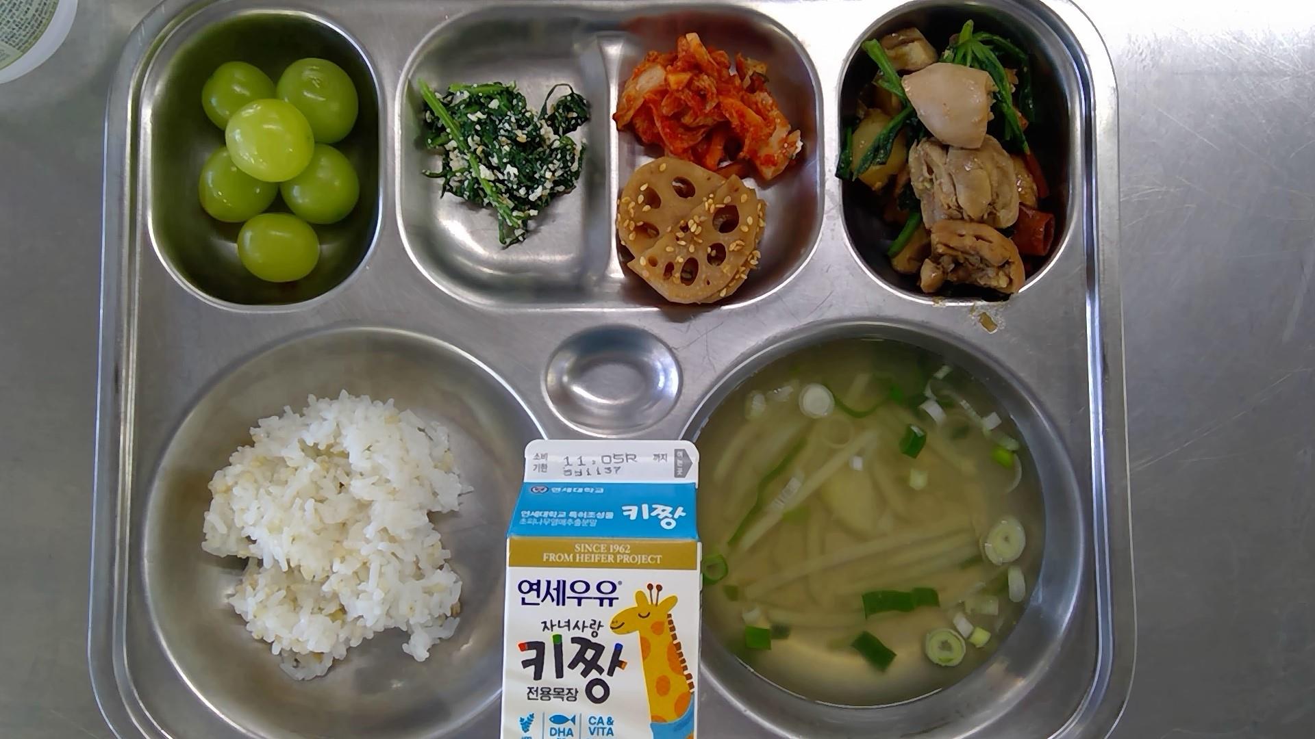 홍국쌀밥감자국(8.9.18): 염도 0.6%안동찜닭(5.6.13.15.16)쑥갓나물두부무침(5.6)연근조림(자율)(5.6.13)배추김치(9)샤인머스캣우유(초)(2)* 에너지/단백질/칼슘/철609.99/33.61/163.86/3.69