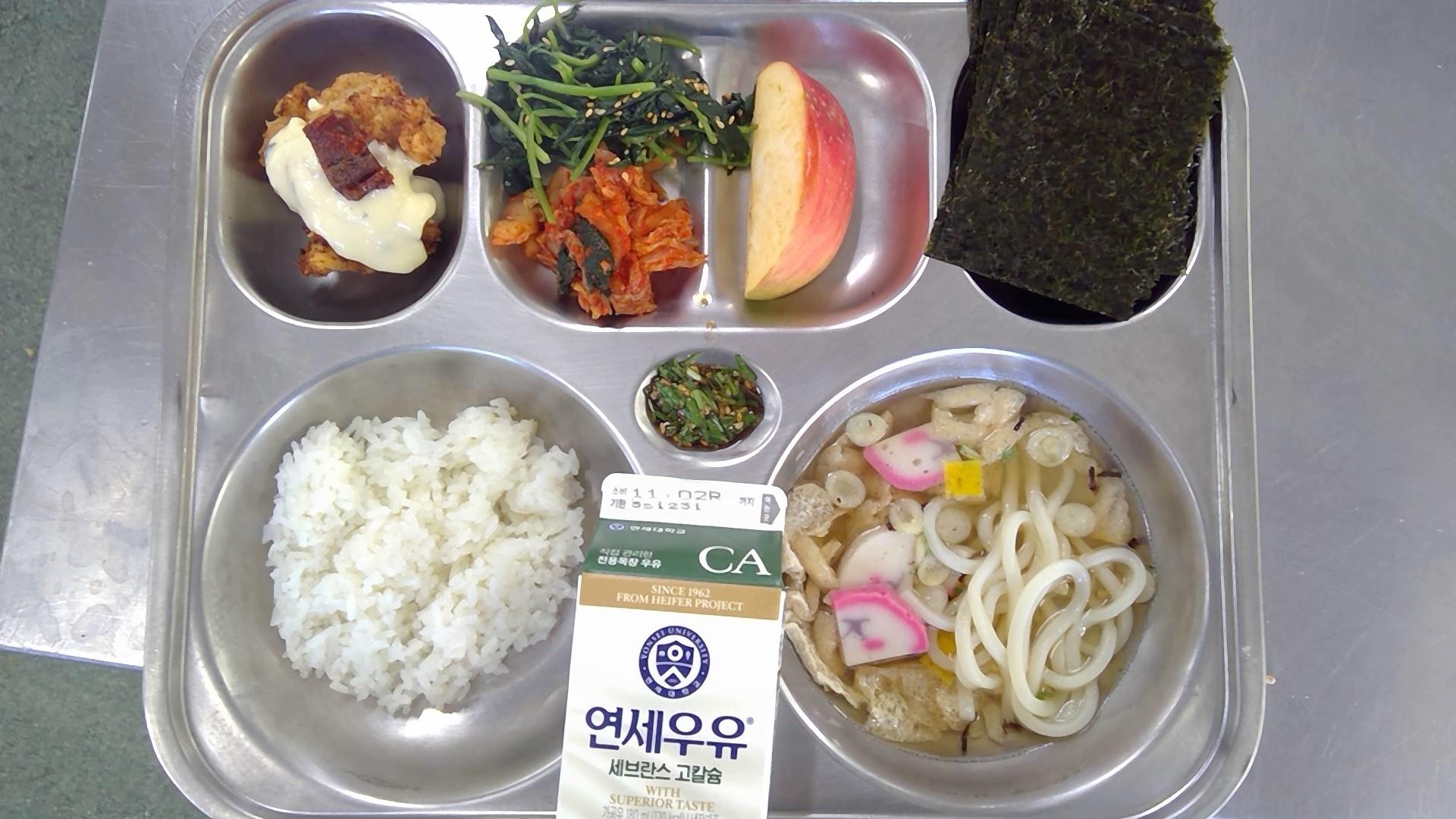 적은밥미니우동(1.2.5.6.7.9.13.18): 염도 0.6%대구볼튀김/바질크림소스(1.2.5.6.9.12.13)참나물무침(5.6)구운김/양념장(5.6)배추김치(9) / 사과(부사)우유(초)(2)* 에너지/단백질/칼슘/철564.92/24.36/157.00/2.04