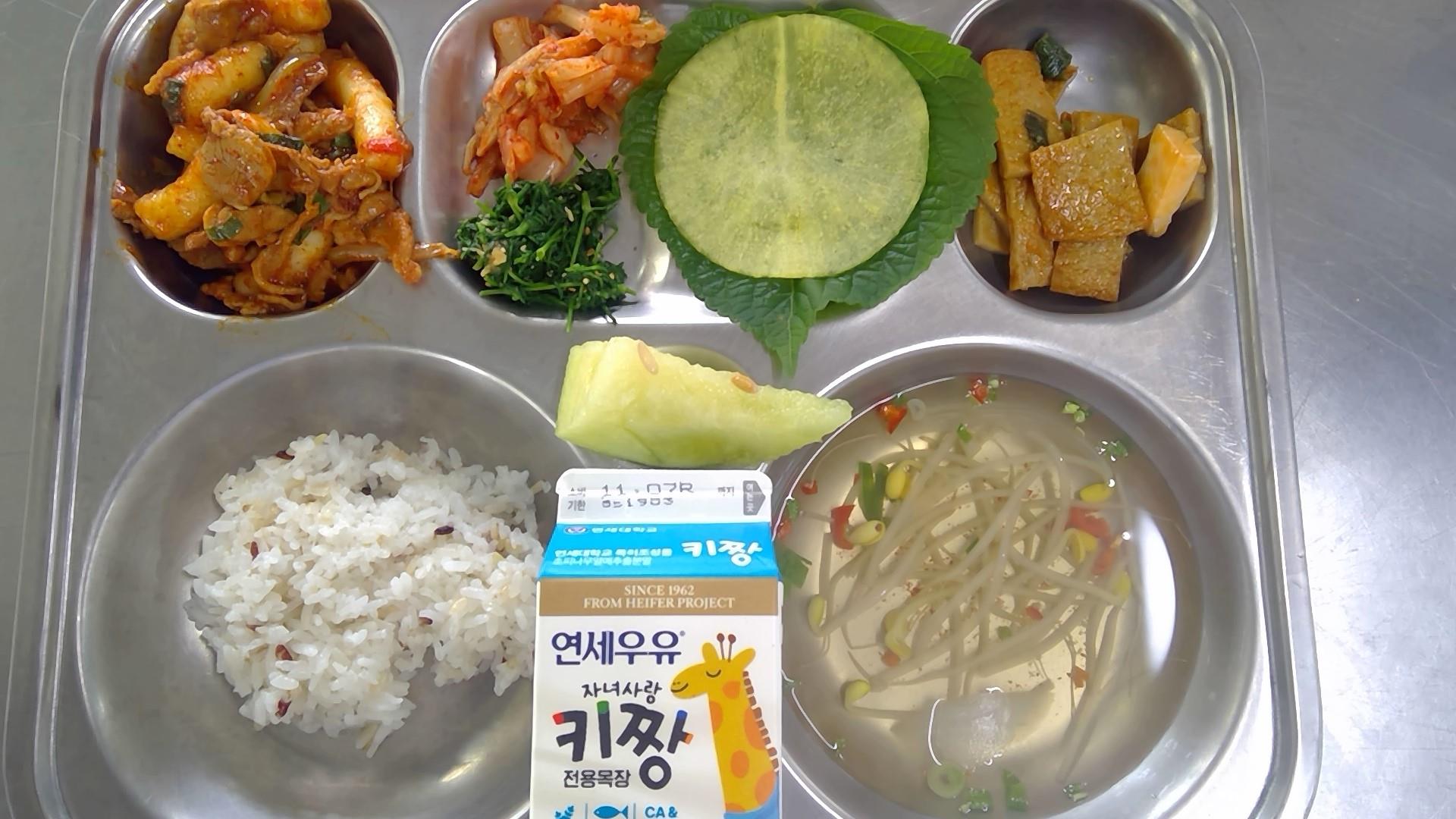 오색현미밥맑은콩나물국(5.6.8.9.18): 염도 0.6%오리양념불고기/무쌈(5.6.13)새송이어묵볶음(1.5.6.13.18)세발나물무침(자율)(5.6.13)배추김치(9)머스크 멜론우유(초)(2)* 에너지/단백질/칼슘/철785.24/29.10/143.67/3.32