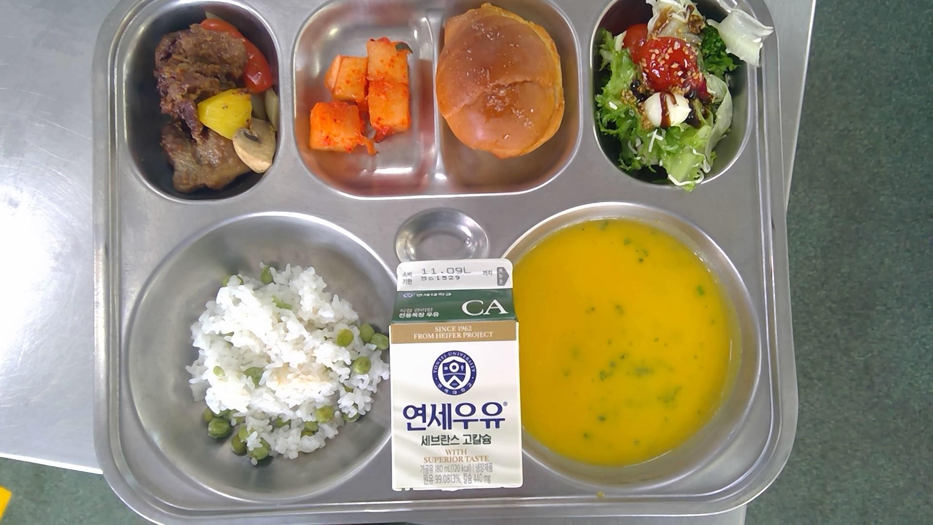 완두콩밥단호박크림스프(2.5.6.13.16): 염도 0.6%목살찹스테이크/구운채소(5.6.10.12.13.16)보코치니샐러드(1.2.5.6.12.13)깍두기(9)소금빵(수제)(1.2.5.6)우유(초)(2)* 에너지/단백질/칼슘/철783.85/31.92/221.01/2.10