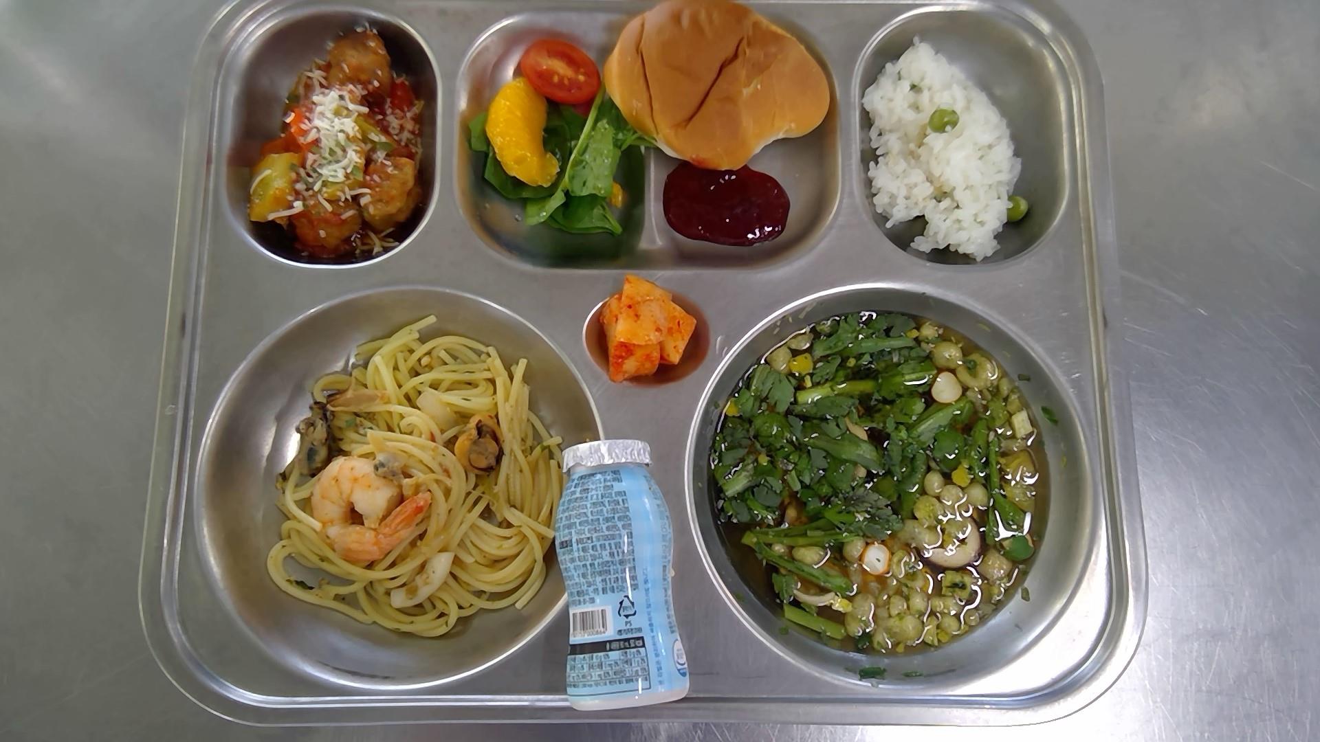 완두콩밥(적은밥)우동국물(1.2.5.6.7.9.13.18): 염도 0.6%봉골레파스타(1.2.5.6.9.13.17.18)미트볼라따뚜이(1.2.5.6.10.12.13.15.16)시금치만다린샐러드(1.2.5.6.12.13)모닝빵/딸기쨈(1.2.5.6.13)깍두기(9) / 우유(초)(2)* 에너지/단백질/칼슘/철719.73/27.83/145.01/4.00