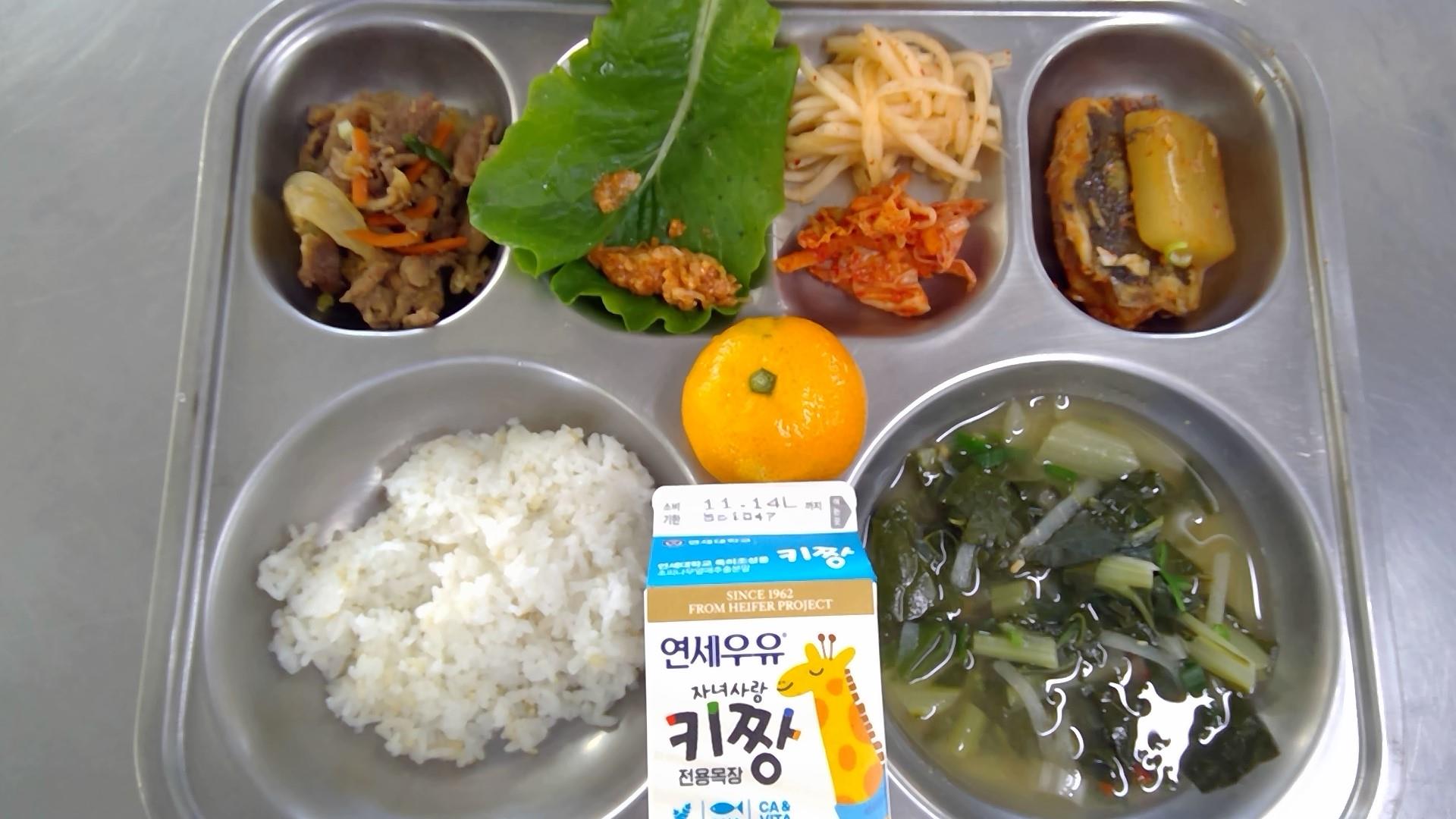 현미쌀밥근대된장국(5.6.8.9.18): 염도 0.6%돼지고기불고기볶음(5.6.10.13)가자미조림(자율)(5.6.13)무생채무침(13)상추쌈/두부쌈장(5.6.13)배추김치(9) / 귤우유(초)(2)* 에너지/단백질/칼슘/철602.78/38.23/187.33/3.04