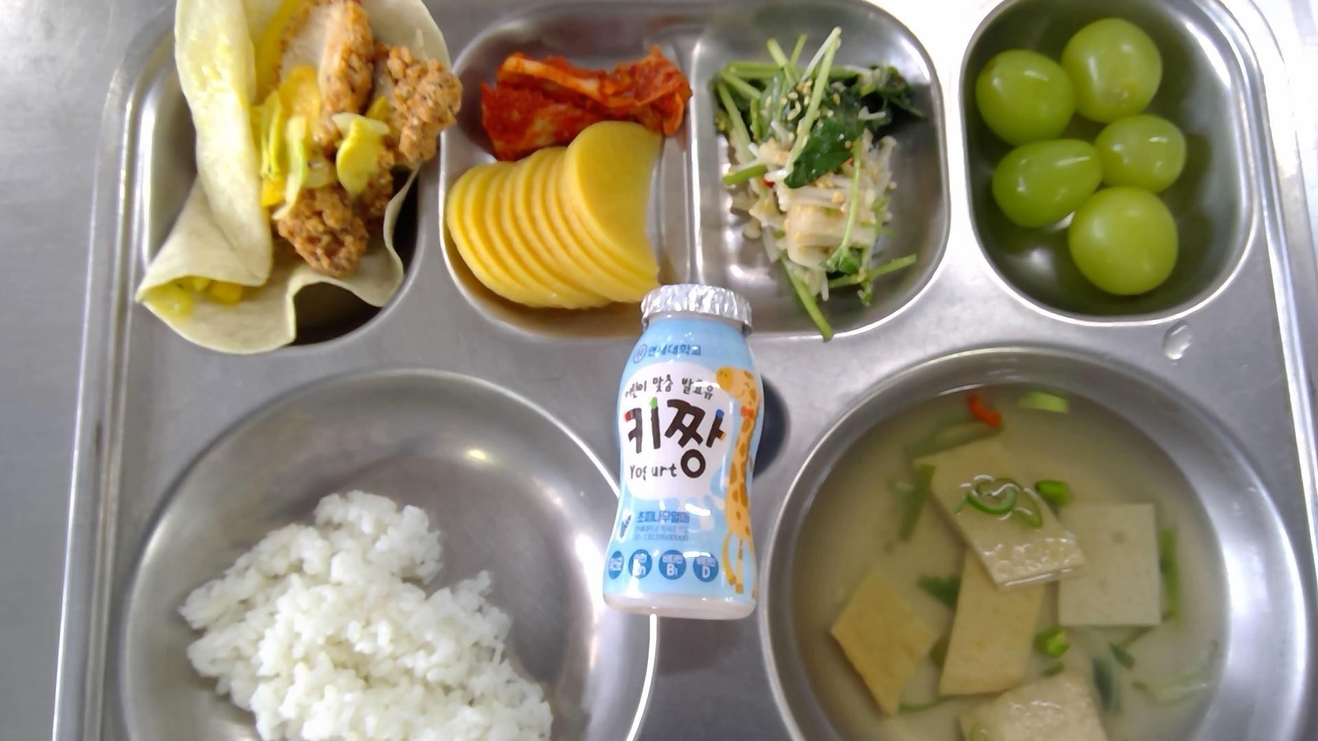 참치김치덮밥(1.2.5.6.9.10.13.15.16)어묵국(1.5.6.8.9.18): 염도 0.6%치킨또띠아랩(1.2.5.6.15.18)참나물팽이버섯무침(자율)샤인머스캣단무지우유(초)(2)* 에너지/단백질/칼슘/철695.87/30.36/171.72/2.40