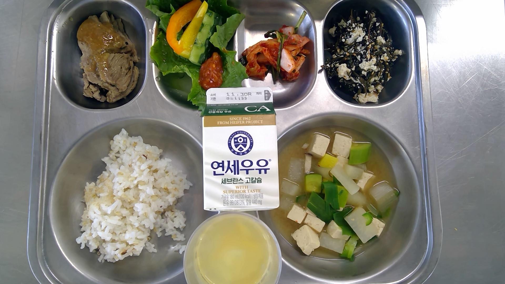 보리밥미더덕된장국(5.6.8.9.18): 염도 0.6%꿀마늘보쌈/상추(5.6.10.12.13.18)톳두부무침(5)채소스틱/쌈장(자율)(5.6.13)담금김치(13)유자차(13) / 우유(초)(2)* 에너지/단백질/칼슘/철644.54/37.97/188.14/4.48